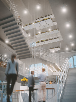 Перед зданием высажены 620 берез и 80 тысяч кустарников. Это будет и красиво, и функционально: само созерцание рощи станет в каком-то смысле актом искусства. Центральный «неф» здания с потолками высотой 22 метра станет связующим звеном ГЭС-2 и позволит посетителям свободно прогуливаться по нему как по проспекту, переходя из одного пространства в другое, поднимаясь на балконы и перемещаясь с одного уровня на другой.
