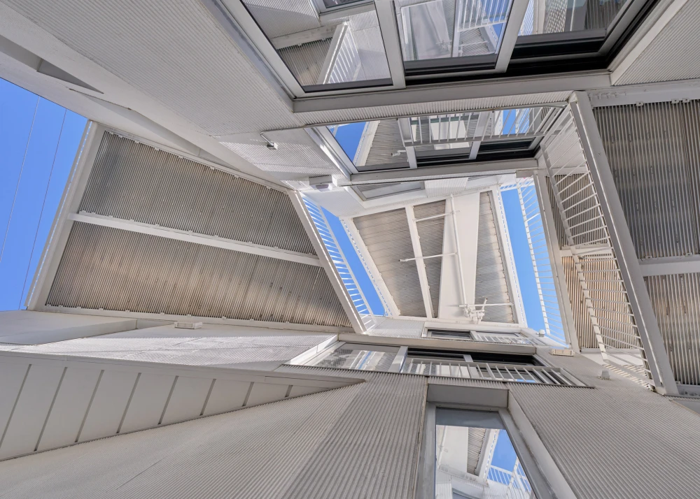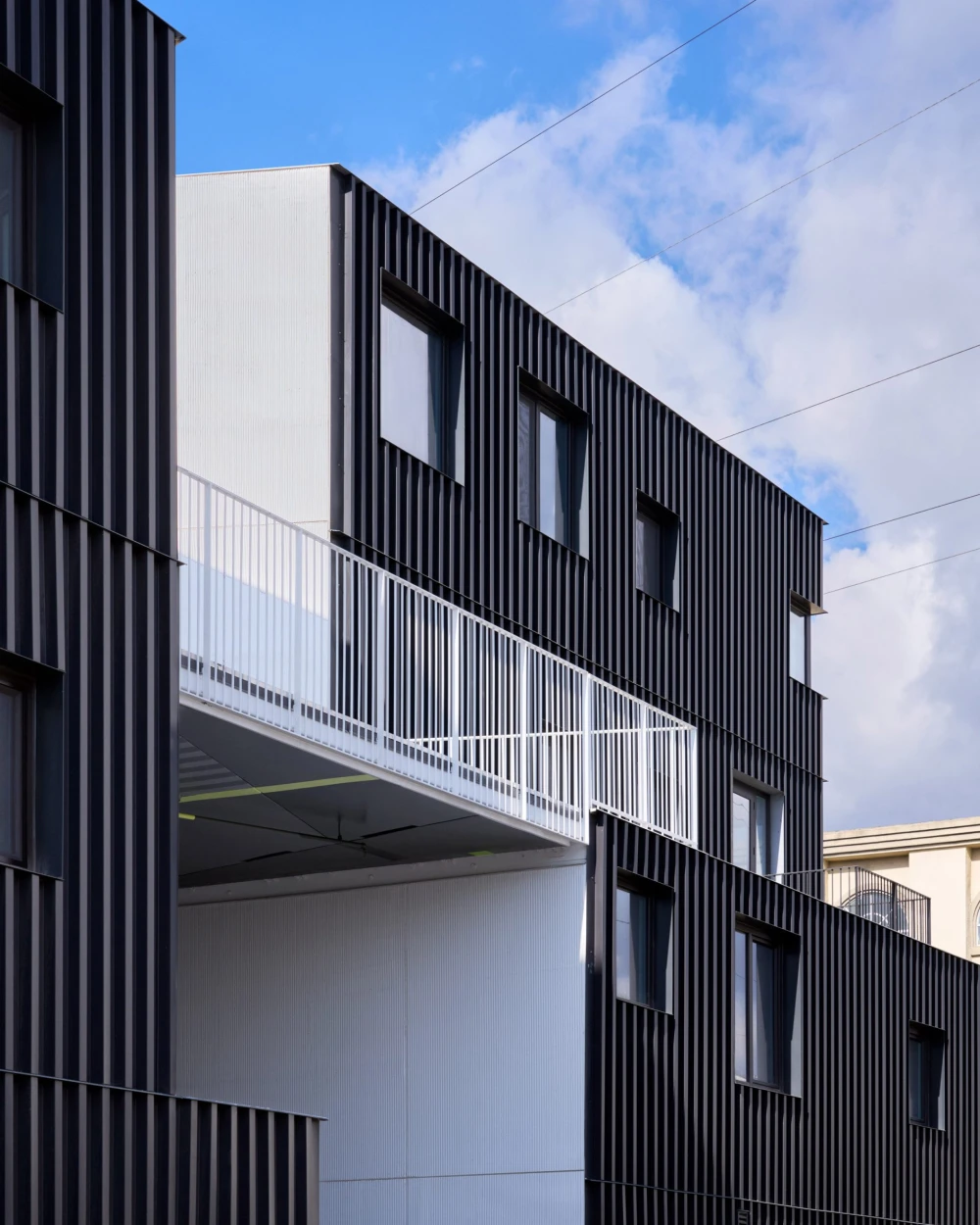 Фасады здания облицованы алюминиевыми панелями угольного цвета и оштукатурены. Barrington 1503 сочетает социальные и частные пространства с многослойными переходами между этими зонами. Снаружи здание напоминает куб, который сформирован четырьмя объемами разных форм и размеров, расположенных вокруг центрального двора. Комплекс должен стать моделью для будущих проектов коливингов, которые в равной степени поддерживает как взаимодействие, так и необходимую приватность.