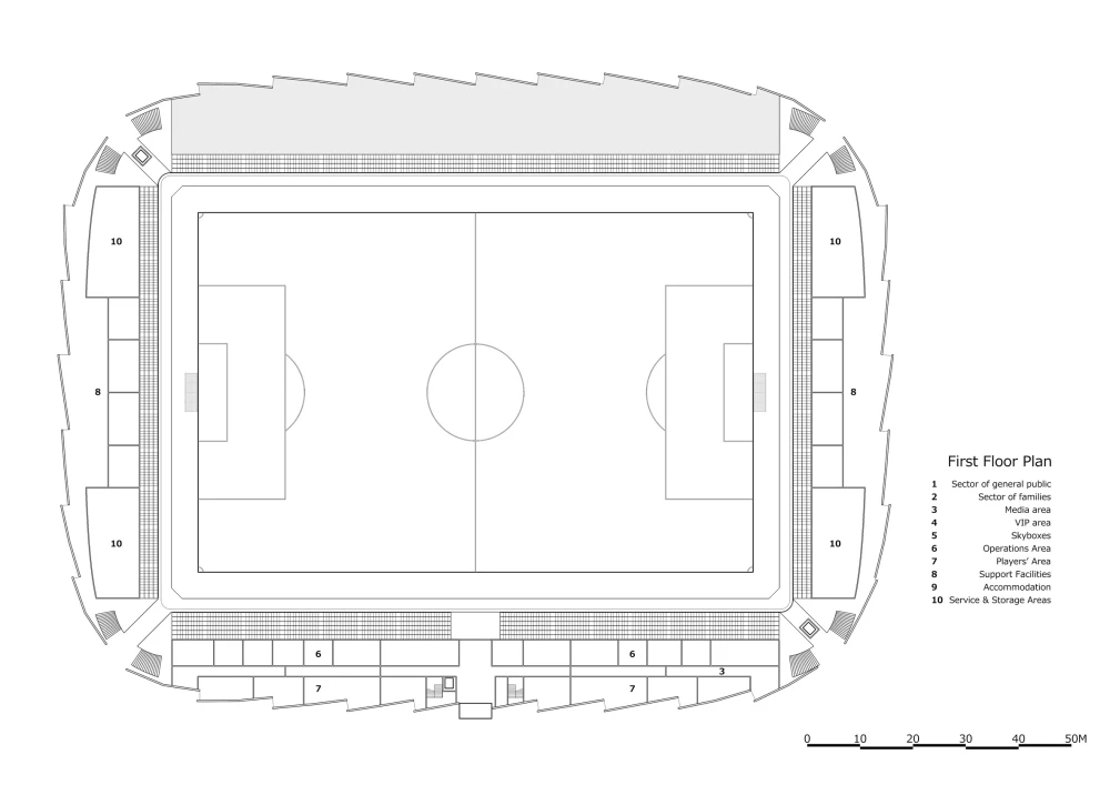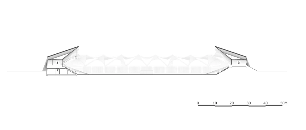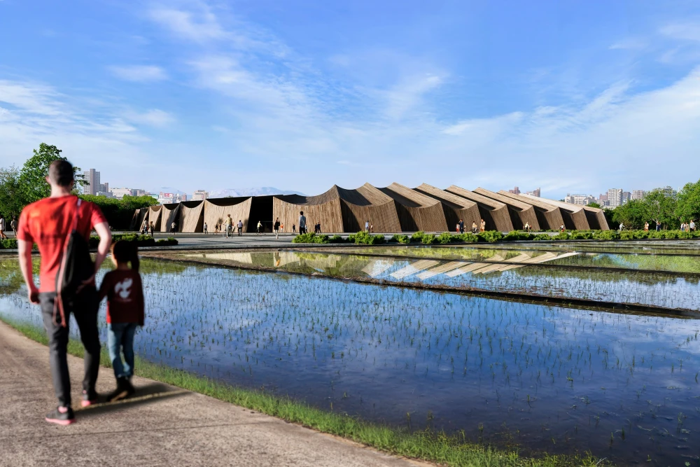 В строительстве стадиона — сборке деревянных каркасов, ферм и внешних стен из местной клееной древесины — примут участие местные жители. Четыре соединенные между собой секции стадиона на двух этажах достигнут в высоте 16 метров. На первом этаже будут располагаться зоны для спортсменов и складские помещения, а наверху — VIP-зоны, трибуны болельщиков и зоны для СМИ. На верхнем этаже также разместятся гостиничные номера. Геометрия стадиона была разработана для минимизации влияния погодных катаклизмов, в частности защиты от ветров. Кроме того, планируется ввести систему сбора дождевой воды для повышения экологической устойчивости проекта. «Каждый компонент будет спроектирован с учетом возможности разборки и повторного использования, что будет способствовать циклическому использованию региональных ресурсов», — заявили в студии.