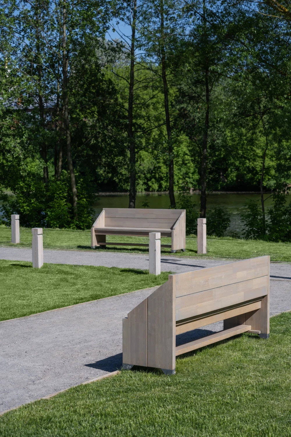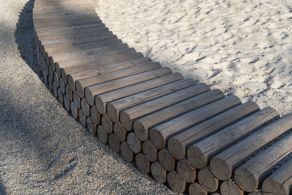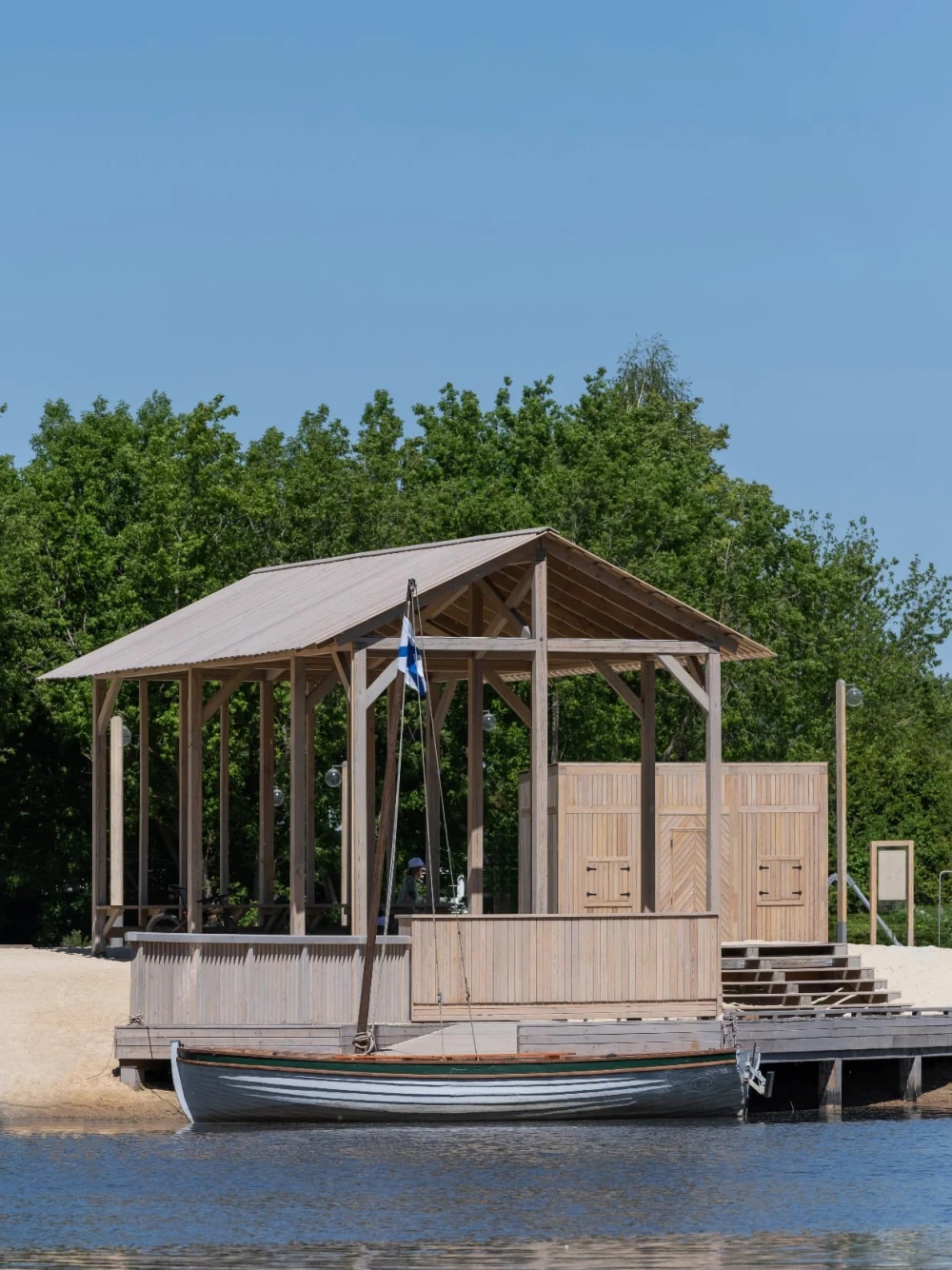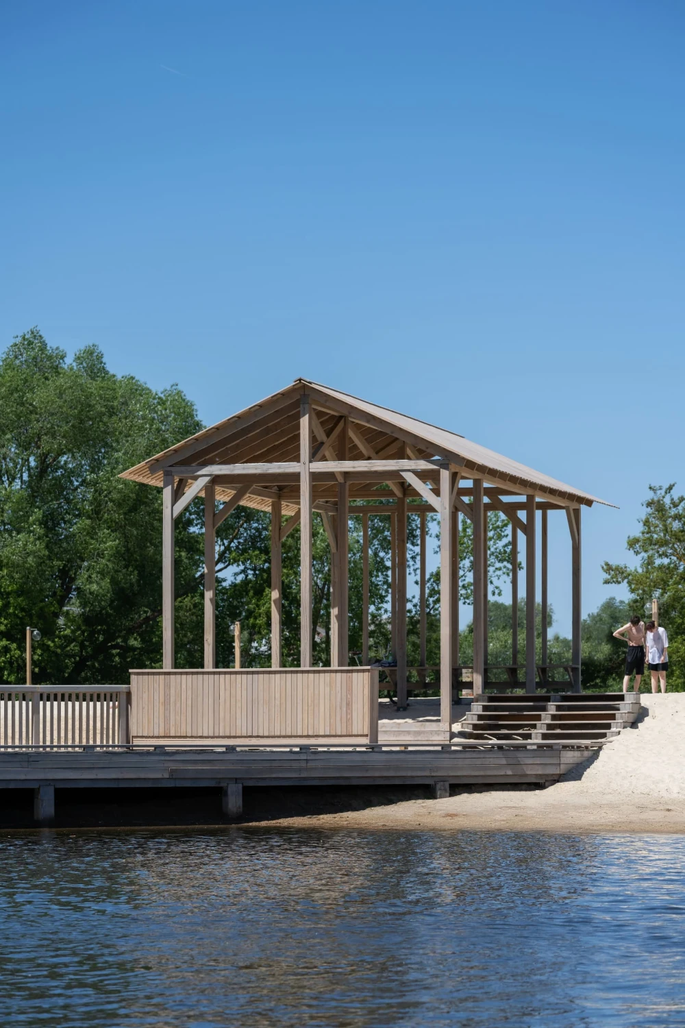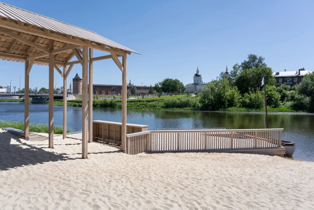 «Важной частью наполнения набережной стали пирсы, разработанные в двух вариантах: для активных видов спорта и для тихого отдыха. Малые архитектурные формы были созданы преимущественно из древесины по принципу стилизации и упрощения форм традиционной русской мебели. Например, некоторые кресла и лавки имеют поворотные спинки, которые позволяют выбрать удобную сторону для обзора».