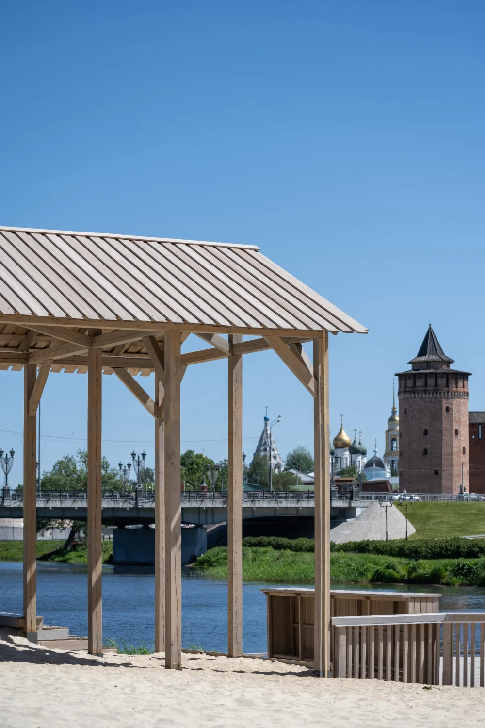 «На набережной главной точкой притяжения стал фудкорт, состоящий из нескольких архитектурных объектов: кафе, проката спортивного инвентаря, лодочной станции и павильонов с пляжной инфраструктурой, которые расположены на общем деревянном настиле, — продолжают авторы проекта. — Пропорции каждого сооружения отражают формы коломенской архитектуры, в частности, кремля. В центре фудкорта расположен уютный дворик с цветниками, вокруг которого мы сформировали зоны отдыха с барными стойками и столиками».