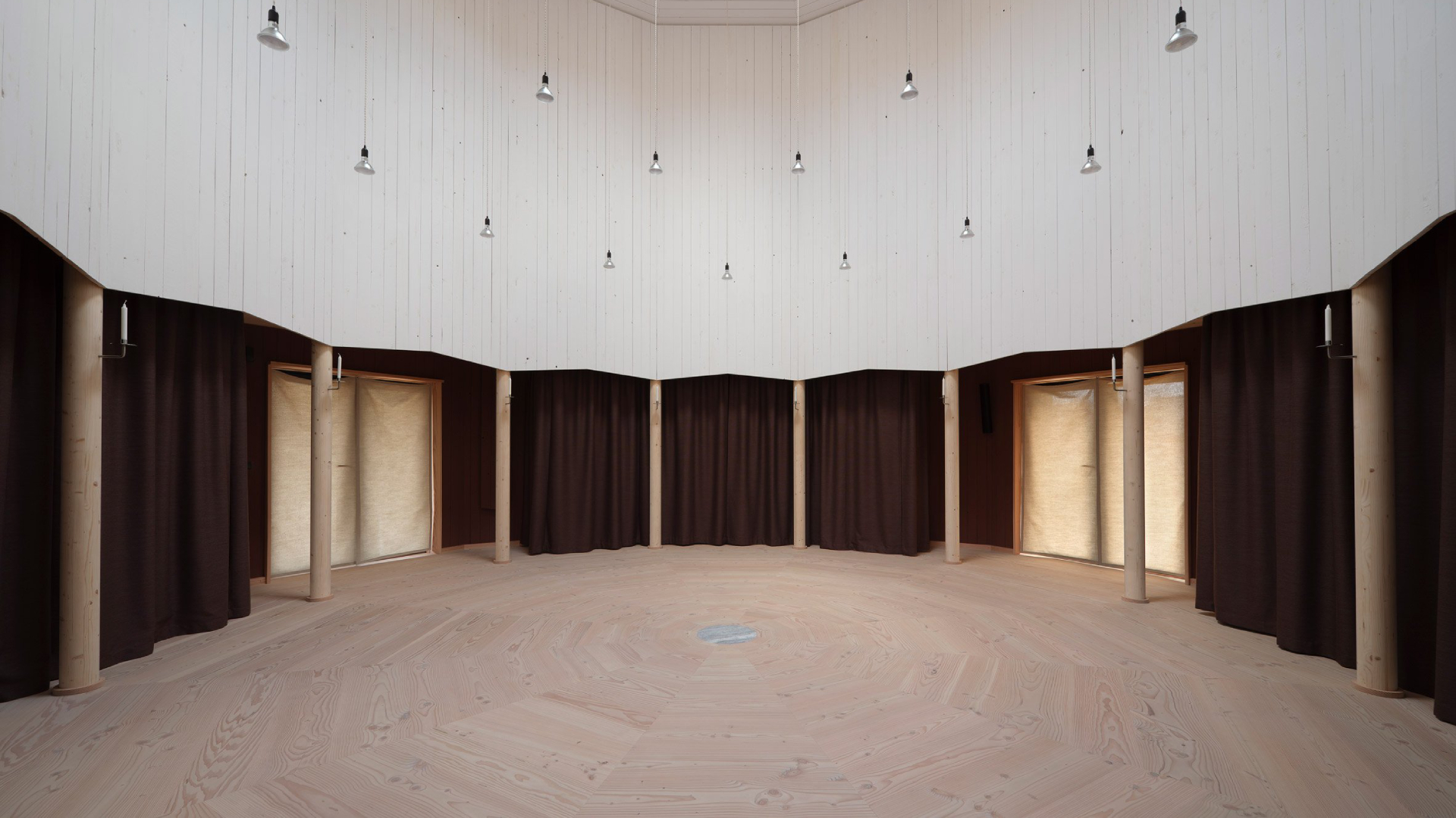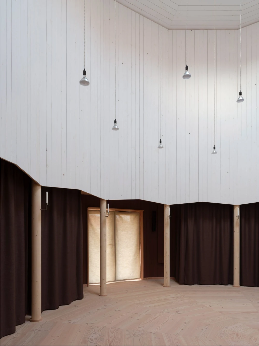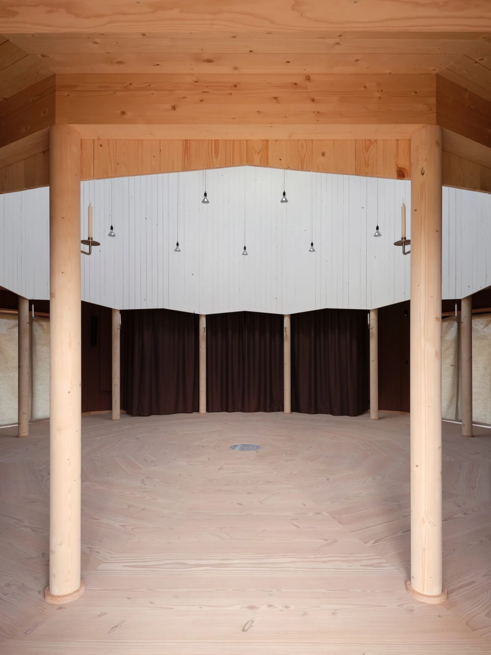 Пол основного зала сделан из досок дугласовой пихты бренда Dinesen различной ширины и длины, которые уложены по радиальному принципу: многогранными «кольцами», сужающимися к центру. К колоннам прикреплены настенные металлические подсвечники, а с потолка свисают минималистичные светильники, окружающие световой люк и подчеркивающие «спартанский стиль» пространства — именно так его характеризует сам дизайнер. Со светлым деревом и белыми стенами эффектно контрастируют темные занавесы между колоннами.