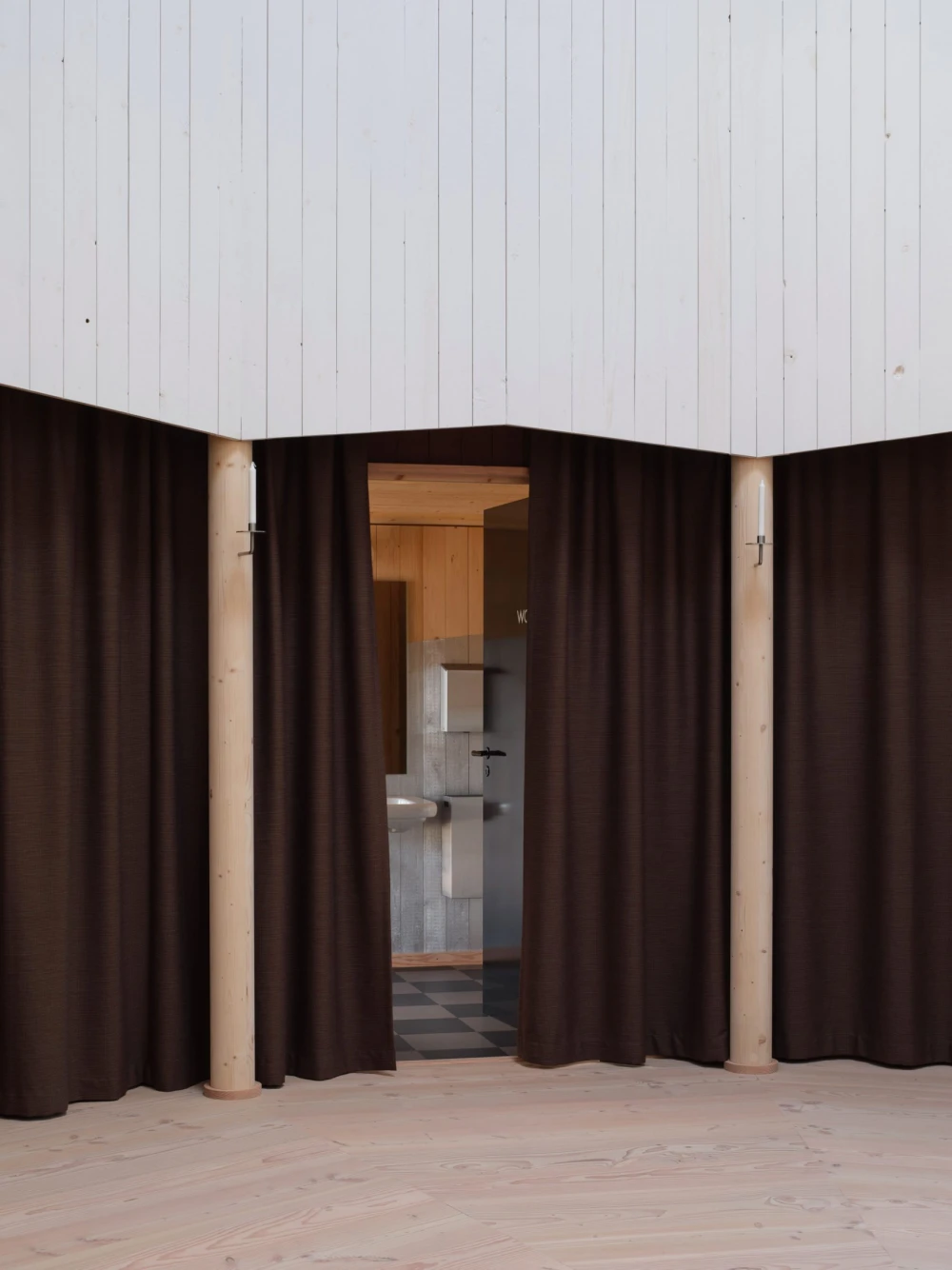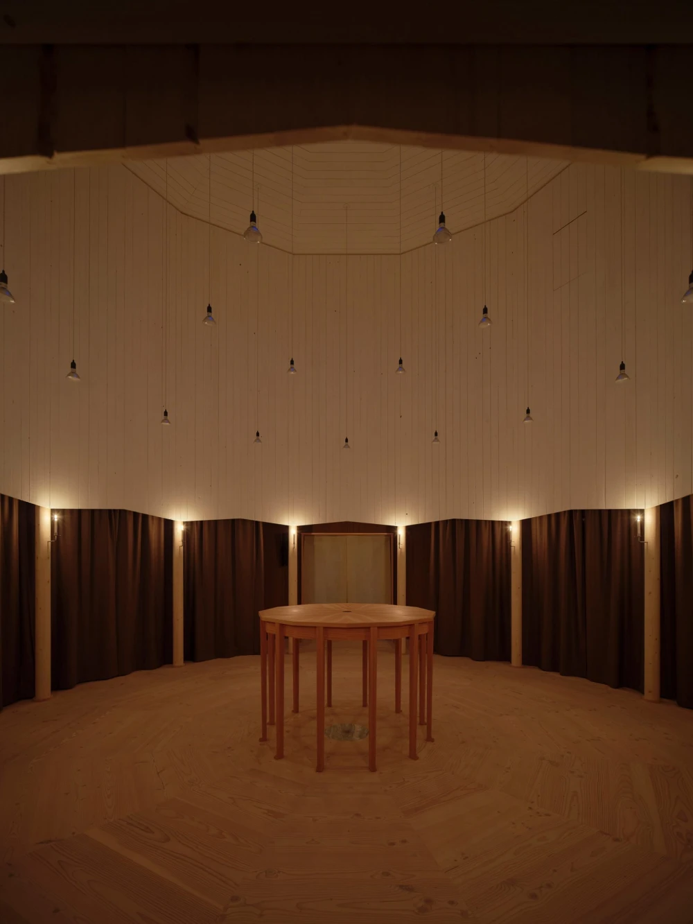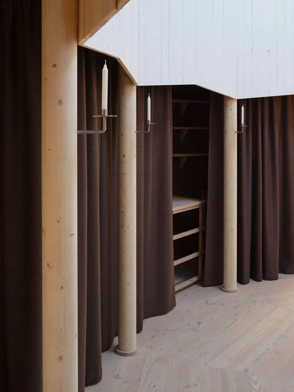 Пол основного зала сделан из досок дугласовой пихты бренда Dinesen различной ширины и длины, которые уложены по радиальному принципу: многогранными «кольцами», сужающимися к центру. К колоннам прикреплены настенные металлические подсвечники, а с потолка свисают минималистичные светильники, окружающие световой люк и подчеркивающие «спартанский стиль» пространства — именно так его характеризует сам дизайнер. Со светлым деревом и белыми стенами эффектно контрастируют темные занавесы между колоннами.