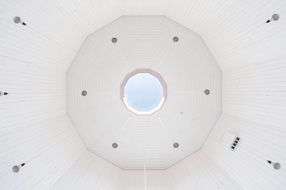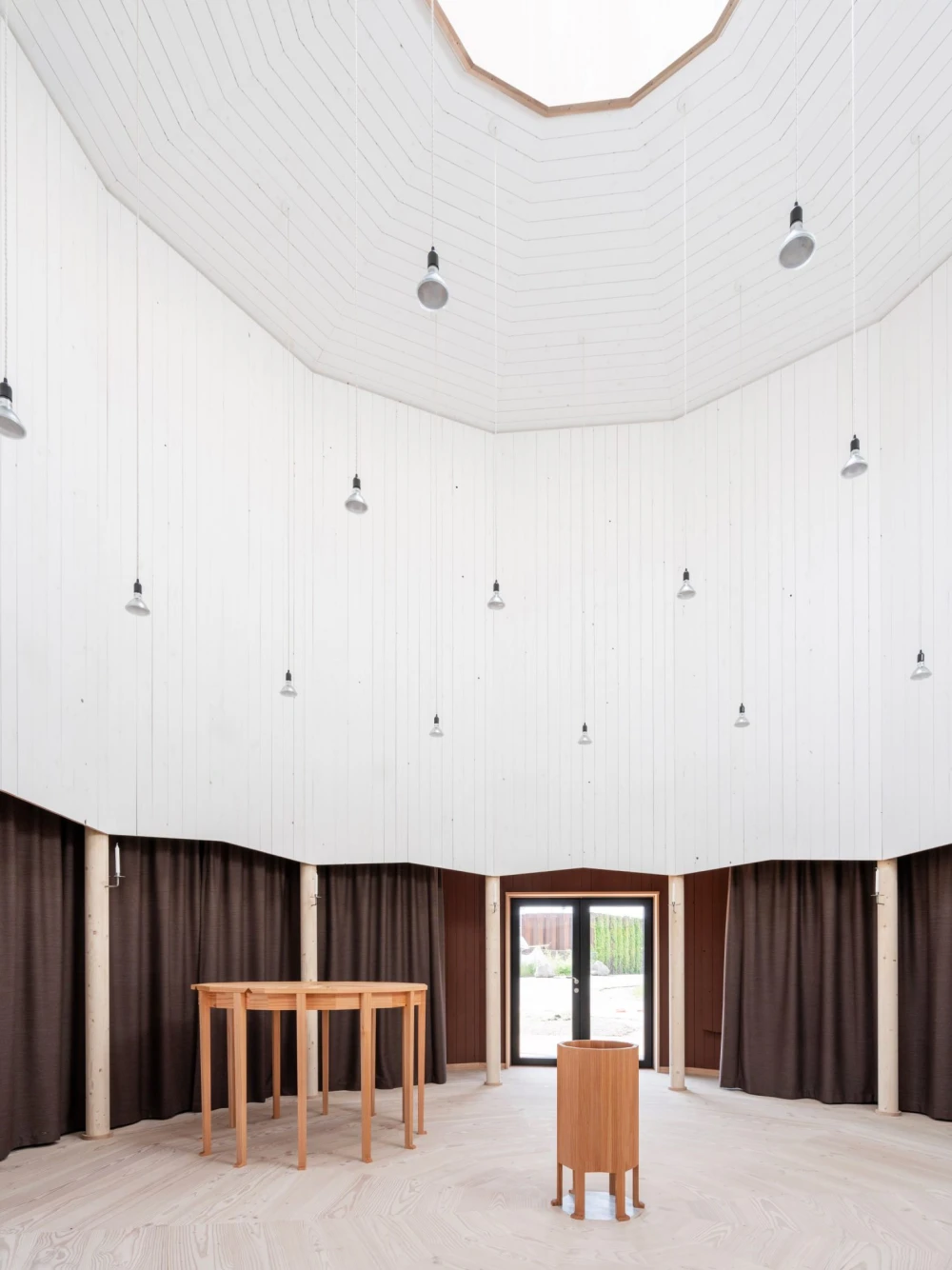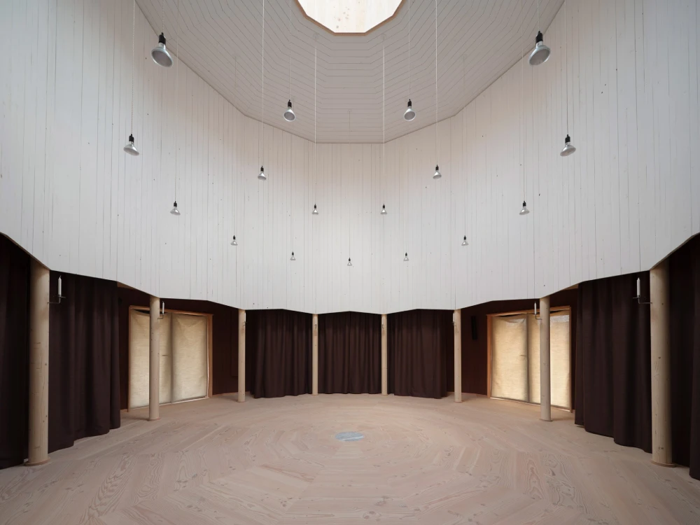 Альтернативой традиционному притвору служит веранда с колоннами, обрамляющая здание по периметру — в этом внешнем кольце также расположили несколько служебных помещений, что позволило сделать основной зал максимально свободным. «Окружающая колоннада превращает процесс прибытия в нечто возвышенное. Это больше, чем просто вход: здесь мы предлагаем пространственную глубину, которая помогает разуму переключиться с мира вовне на сосредоточенную атмосферу внутри», — отметил Нильсен.