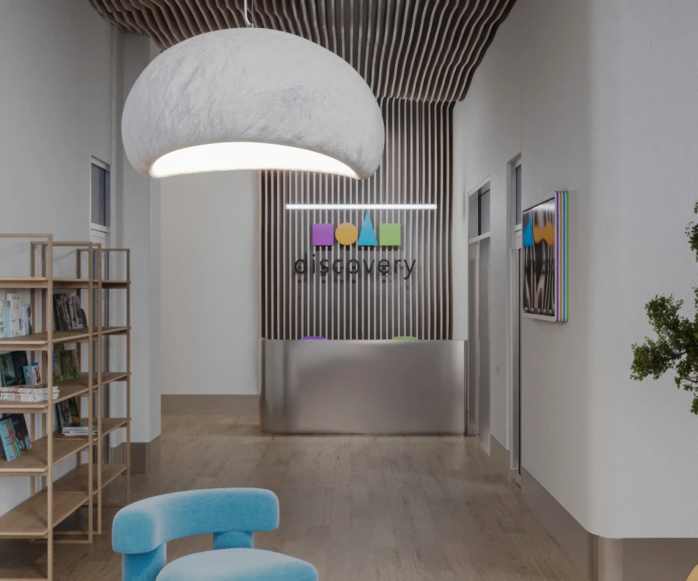 «К архитектуре бюро WALL отсылают входные группы, которые оформлены с использованием стали, а также элементы из дерева и закругленные обтекаемые формы, которые перекликаются с элементами интерьеров лобби жилых корпусов. Для нас было важно сохранить лаконичность линий: хотелось сделать пространство отличающимся от стандартных детских садов, где много шумов, неперекликающихся друг с другом плоскостей и принтов. Добиться ощущения визуальной чистоты помогает белый цвет, который выбран в качестве базы, а оживляют его и придают интерьеру дружелюбности фирменные оттенки Discovery. Отдельно хочется отметить стальные колонны (редкость для дошкольных учреждений) и контрастирующие с ними потолки из дерева с рельефным волнистым декором: рассматривая его, дети будут развивать воображение. Для Discovery важно, чтобы ребенок проводил много времени в эстетичном пространстве: так мы прививаем ему вкус и с самых ранних лет закладываем правильные представления о качественном дизайне»