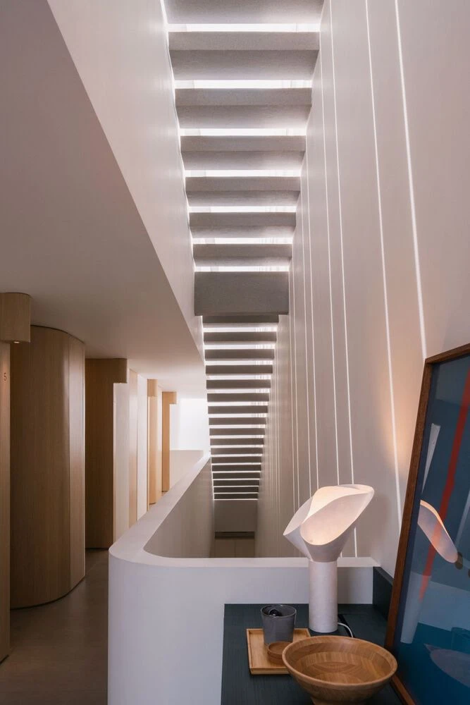 В самом большом цилиндре находится лестница с парящими ступенями, которые, направляя проникающий сверху свет, создают ритмичный рисунок на стенах. Отражающий лучи пруд на первом этаже усиливает впечатление, подчеркивая взаимодействие света, воздуха и воды.