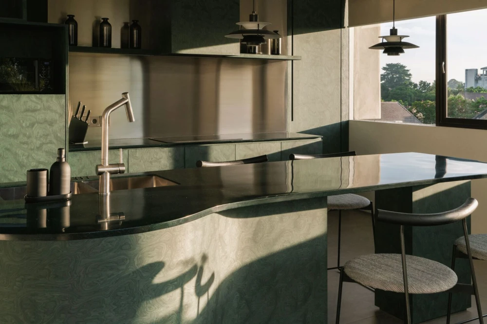 Формы мебели вторят плавным очертаниям фасада, создавая ощущение единства. В отделке преобладает дерево теплого оттенка, которое уравновешивает грубую фактуру необработанного бетона. Для общей кухни архитекторы выбрали зеленые тона, которые перекликающиеся с живыми растениями на террасе, задуманной как оазис спокойствия над оживленными улицами Джакарты.