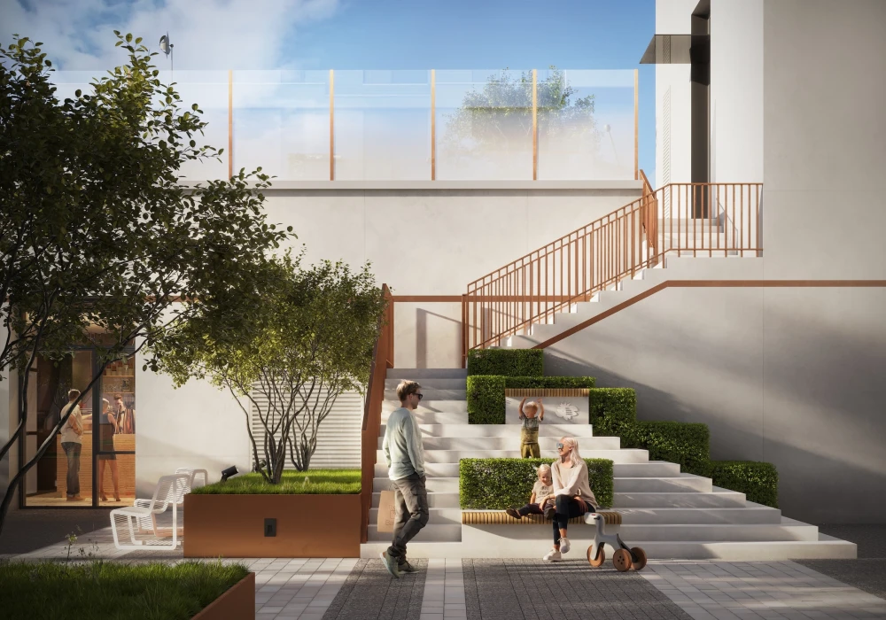Лейтмотив связи с водой поддерживает и расположенный на возвышении приватный двор с лестницей, которая повторяет каскадную форму здания и сама состоит из зеленых террас. С точки, куда она ведет, открывается панорама, которую можно увидеть только отсюда. Кроме того, в проекте предусмотрена дополнительная зеленая зона — она расположится на крыше одноэтажного коммерческого строения. И все это — не считая спортивных и рекреационных объектов Капустинского парка.