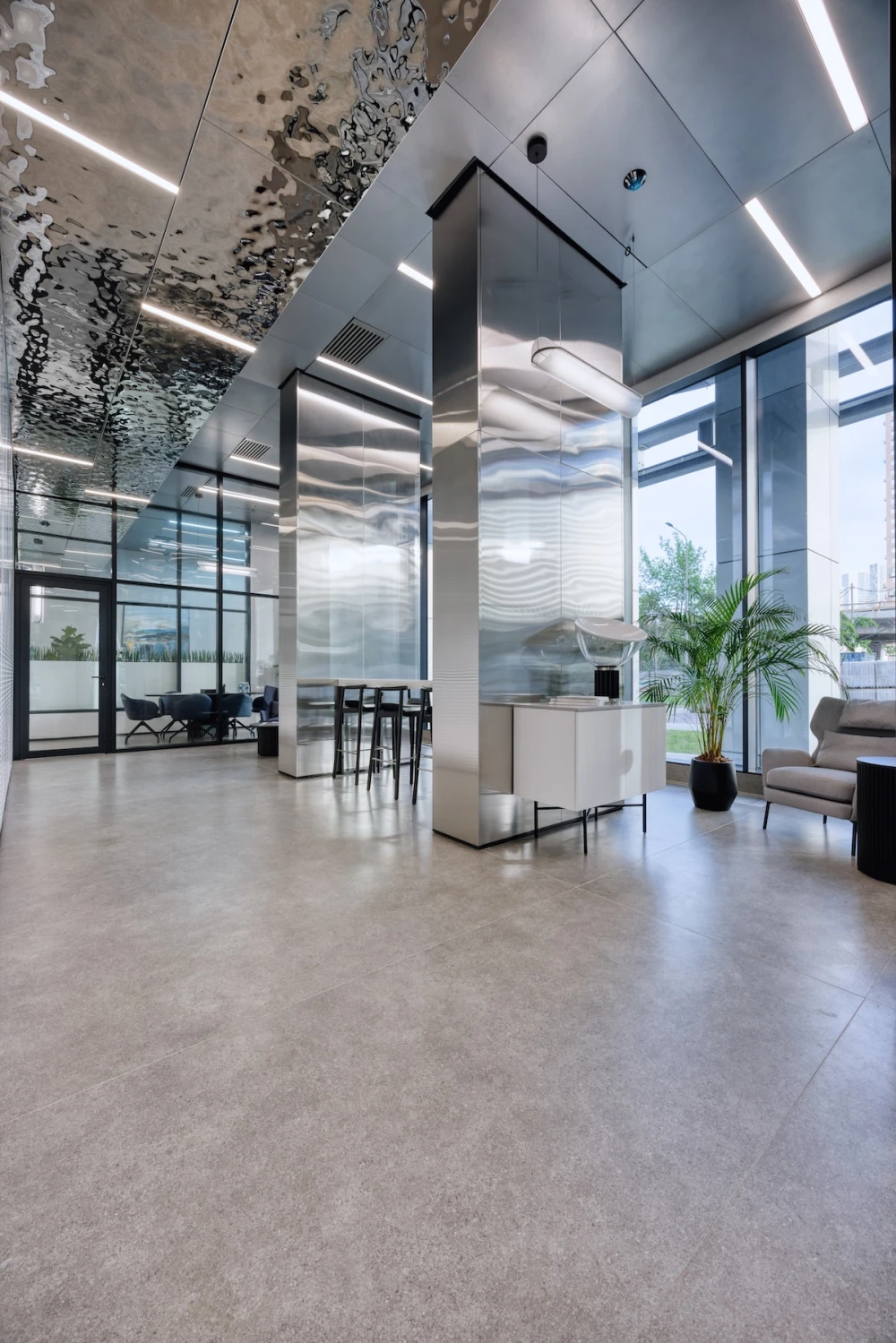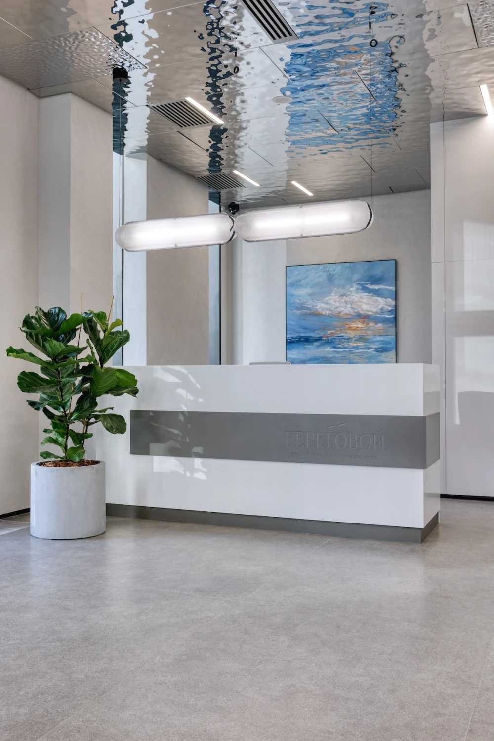 В ЖК «Береговой» знают об этом не понаслышке: здесь все продумано до мелочей, и изначально заложенная концепция прослеживается и во внутренней отделке. Лобби — а это первое, что увидят резиденты, — сразу настраивает на нужный лад. Интерьер его выдержан строго и лаконично, но и здесь есть напоминание о безмятежном движении реки за окном: эффектная отделка потолка напоминает бликующую водную гладь.