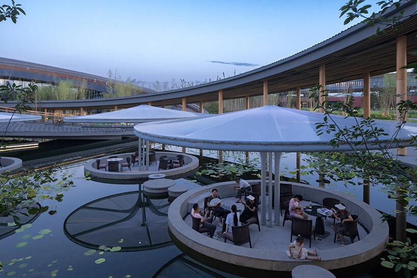 Рядом с залом находится двусторонняя сцена, где можно увидеть сычуаньскую оперу. Площадка расположена так, чтобы зрители могли собираться как внутри, так и на улице. Вдобавок к этому по периметру расположена чайная комната с бамбуковым каркасом, построенная по образцу исторической чайной Heming в Чэнду. Оттуда посетители тоже могут наблюдать за представлениями, что подчеркивает социальную и созерцательную роль двора. Между кольцами разместился пруд, который отражает значимость Чэнду как сельскохозяйственного региона. Узкая дорожка пересекает воду, создавая места для любования окружающей природой, а на пруду организованы плавучие обеденные зоны с навесами, выполненные в форме стилизованных листьев лотоса.