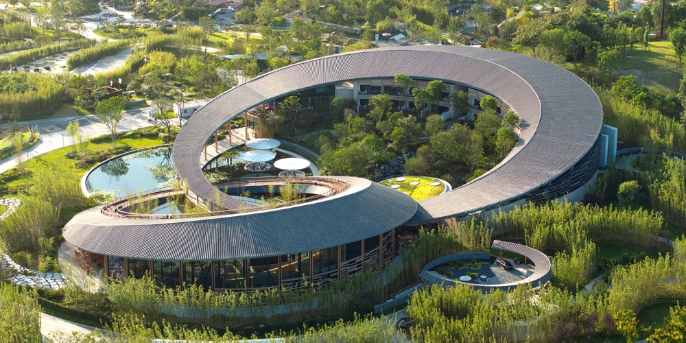 Вокруг павильона построены небольшие гостиницы с видом на густые зеленые склоны, внизу которых расположился ряд бассейнов и горячих источников, предназначенных для круглогодичного купания. По замыслу архитекторов, все эти элементы должны превратить выставочный павильон в объект культурного и экологического туризма в Чэнду.