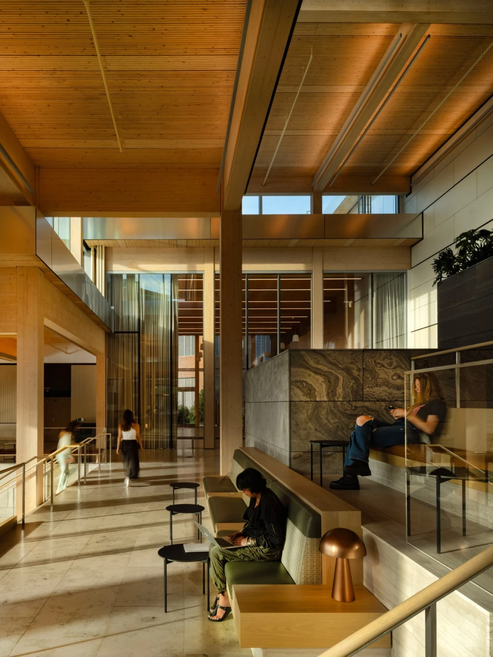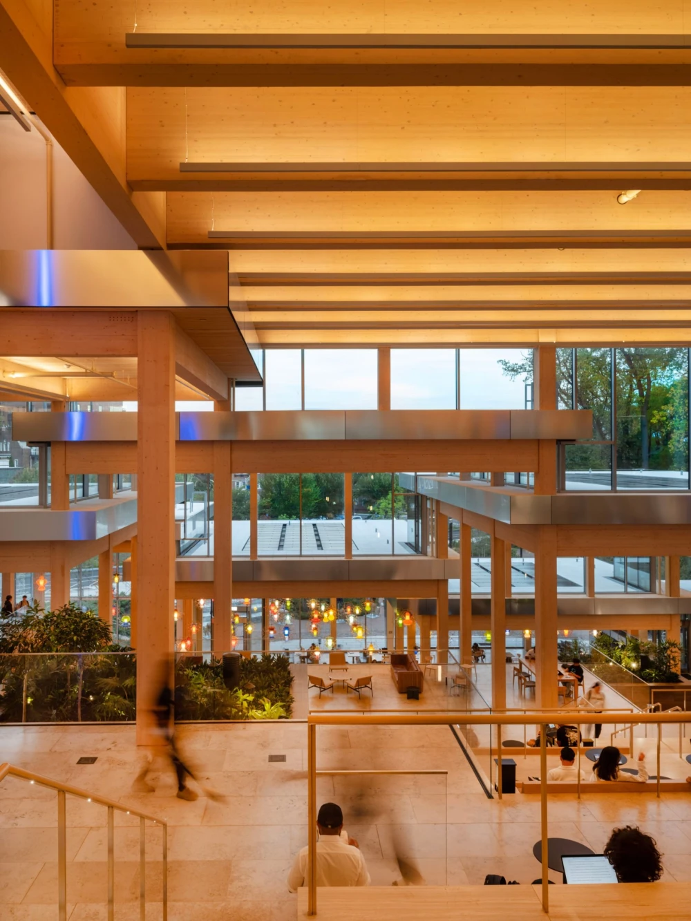 Конструкция здания сделана из дерева. Ряды колонн и балок из массива дизайнеры из Rockwell Group решили дополнили отделкой из известняка и столярными изделия из светлого дуба, чтобы создать теплую атмосферу и связать россыпь разных помещений в единое целое.