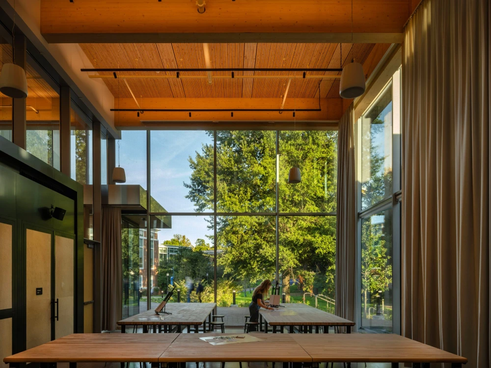 Проект получил платиновый сертификат LEED, подтверждающий высокий уровень энергоэффективности. На крыше здания предусмотрено почти 1000 фотоэлектрических панелей, которые генерируют примерно половину необходимой электроэнергии, а под землей находится цистерна для дождевой воды емкостью 20 000 галлонов. Обогревается пространство за счет теплого пола, в то время как двойное остекление помогает минимизировать потери тепла.