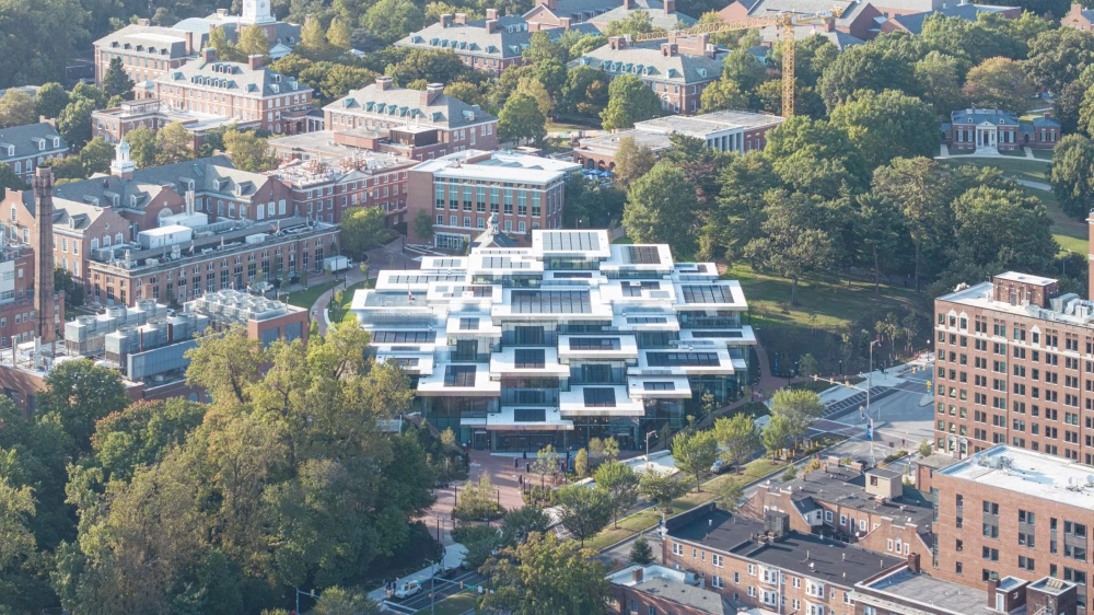 Бюро BIG и нью-йоркская студия Rockwell Group завершили строительство студенческого центра в Университете Джонса Хопкинса в Мэриленде, США. Здание площадью 14 000 кв. метров, расположенное на краю кампуса, представляет собой каскад из множества прямоугольных массивных объемов со стеклянными фасадами и плоскими крышами.