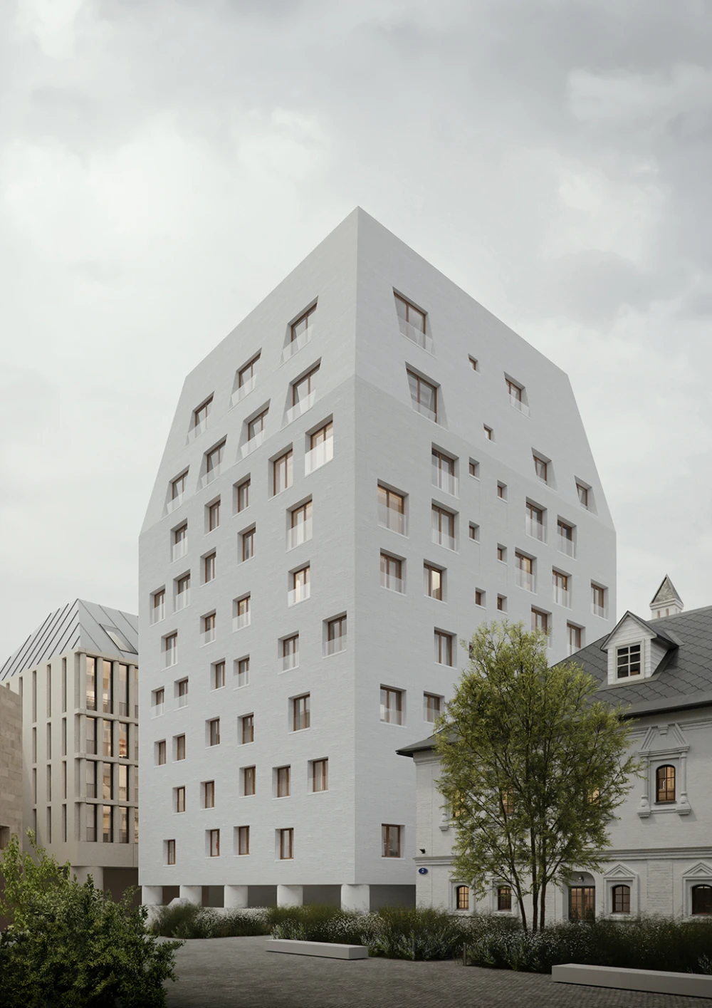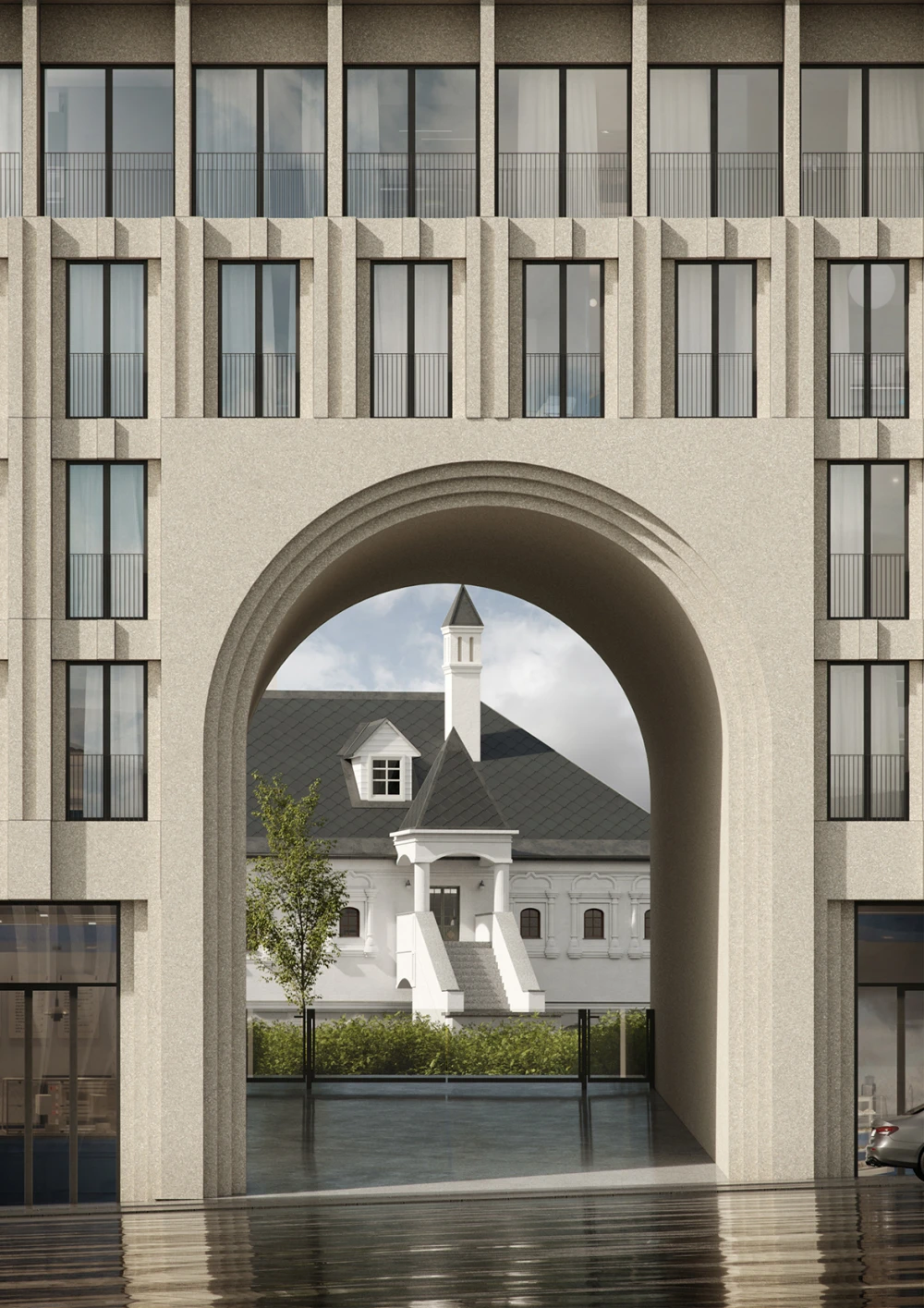 Основным элементом дома, выходящего на Кузнецкий Мост, выступает арка, важная деталь, характерная для окружающей застройки: здания Международного торгового банка, доходного дома Гагарина, Сандуновских бань. Силуэты клубных корпусов внутри квартала (в том числе самого высокого 10-этажного дома) вдохновлены Палатами Тверского Подворья. Ригельный кирпич и цвет — реверанс этой исторической постройке и способ сбалансировать объемы зданий, находящихся внутри двора. Асимметричные окна, утопленные в стены, станут еще одной характерной особенностью 10-этажного корпуса. За архитектурным решением стоит предусмотрительность — здание со всех сторон окружено другими постройками, но резиденты могут быть уверены в своей приватности.