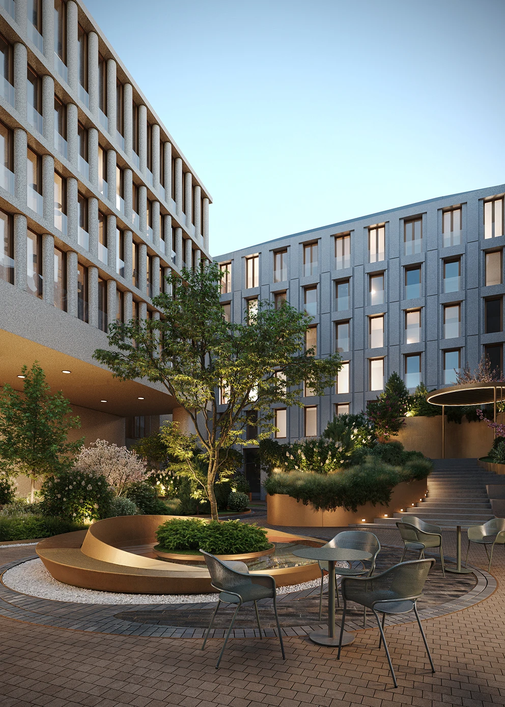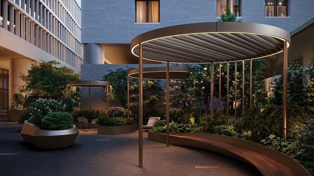 организовано на двух уровнях: нижний отдадут под приватный сенсорный сад с фонтаном, амфитеатром и уютными «зелеными гостиными»,