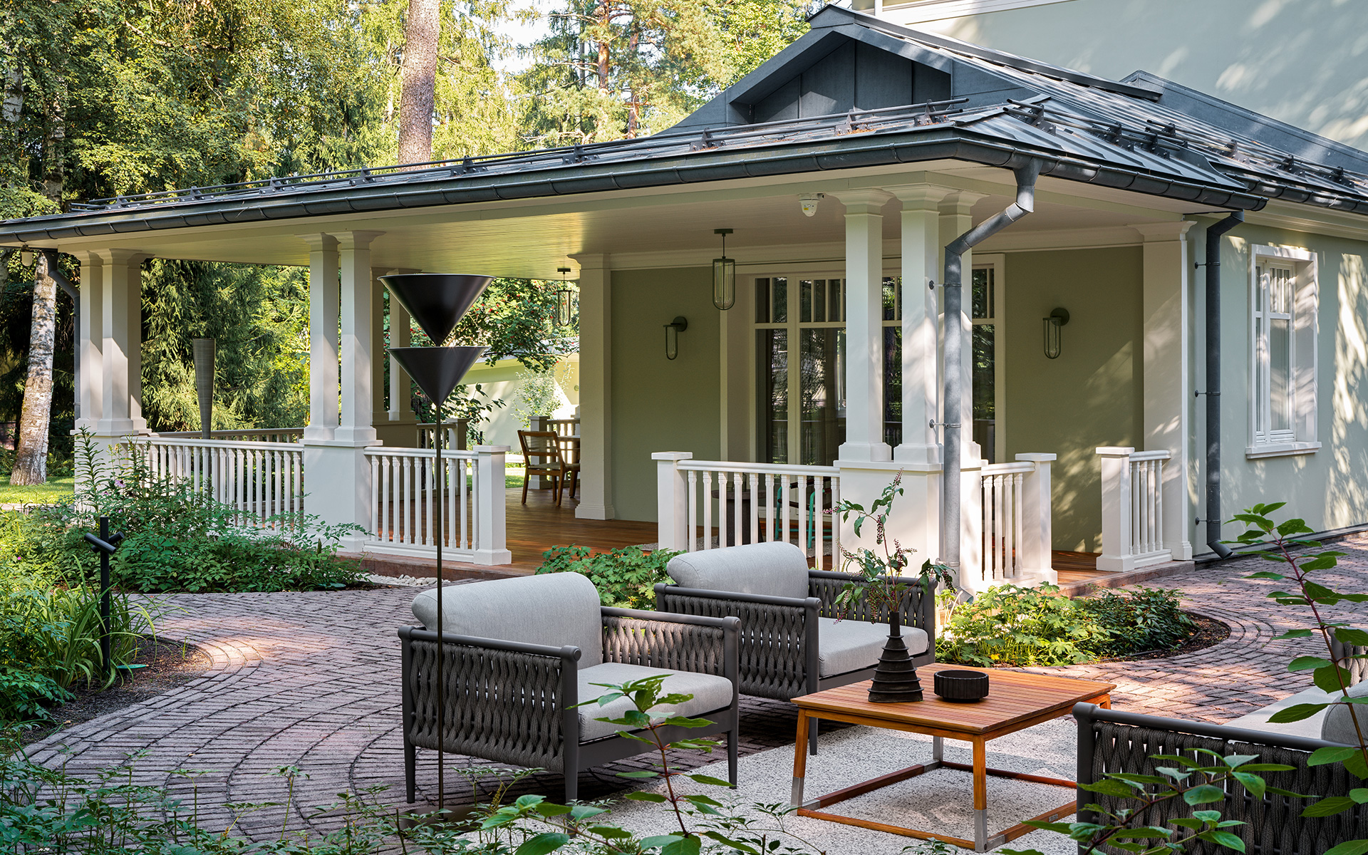 Большое внимание уделили поиску цвета зданий: он должен был отсылать к истории дачи и в то же время быть созвучным всем проектным решениям. Идеальным оказался сложный шалфейный тон, который помог подчеркнуть образ восстановленной усадьбы первой половины XX века и гармонично вписать весь ансамбль в окружающий ландшафт с вековыми деревьями и пышными кустарниками.