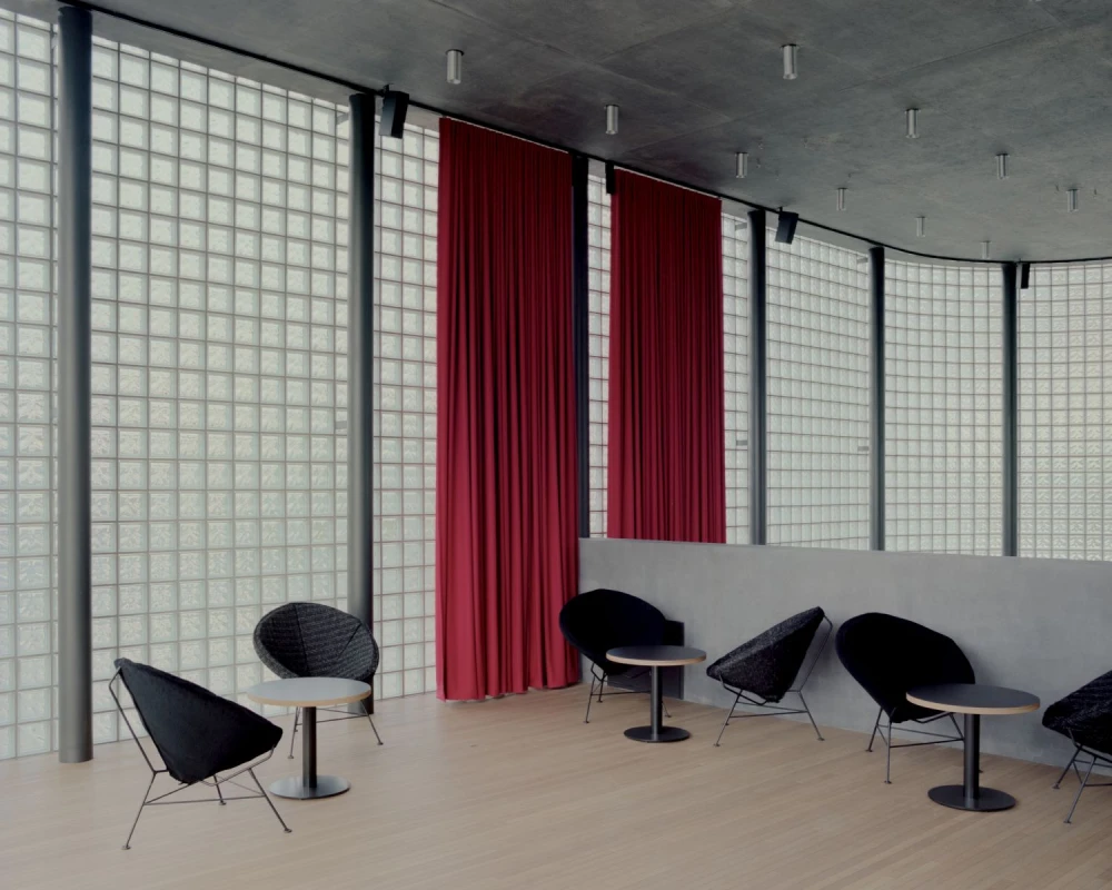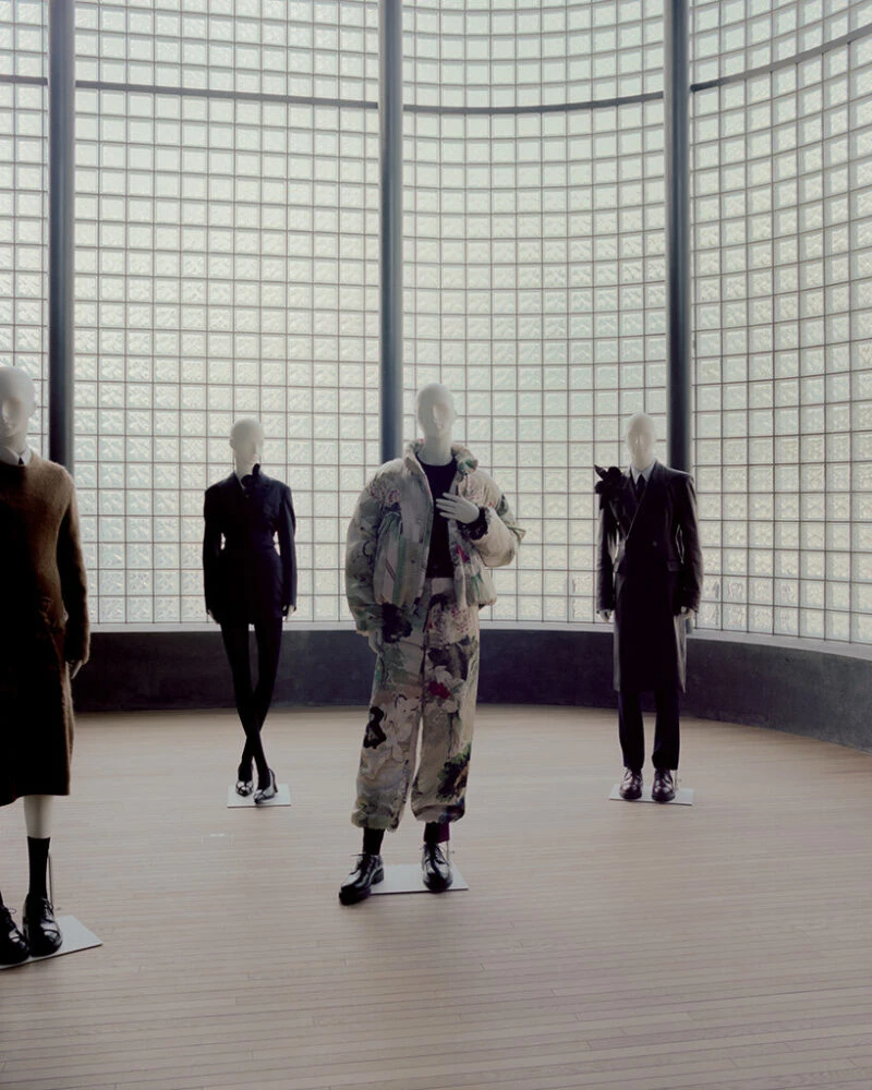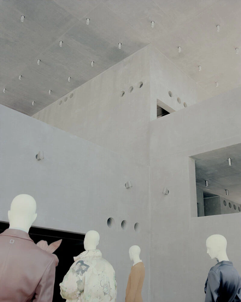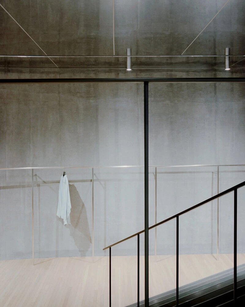 Чтобы адаптировать здание к естественному уклону участка, архитекторы спроектировали систему антресольных уровней, которые соединены центральным вертикальным ядром. В результате получилась непрерывная последовательность пространств, где каждая зона обладает своим характером, оставаясь при этом частью единого целого. Сдержанная палитра материалов включает бетон, стекло, сталь, камень и дерево. Они определяют пространство, создавая нейтральный, но насыщенный фактурами интерьер, где выставленная одежда занимает центральное место.
