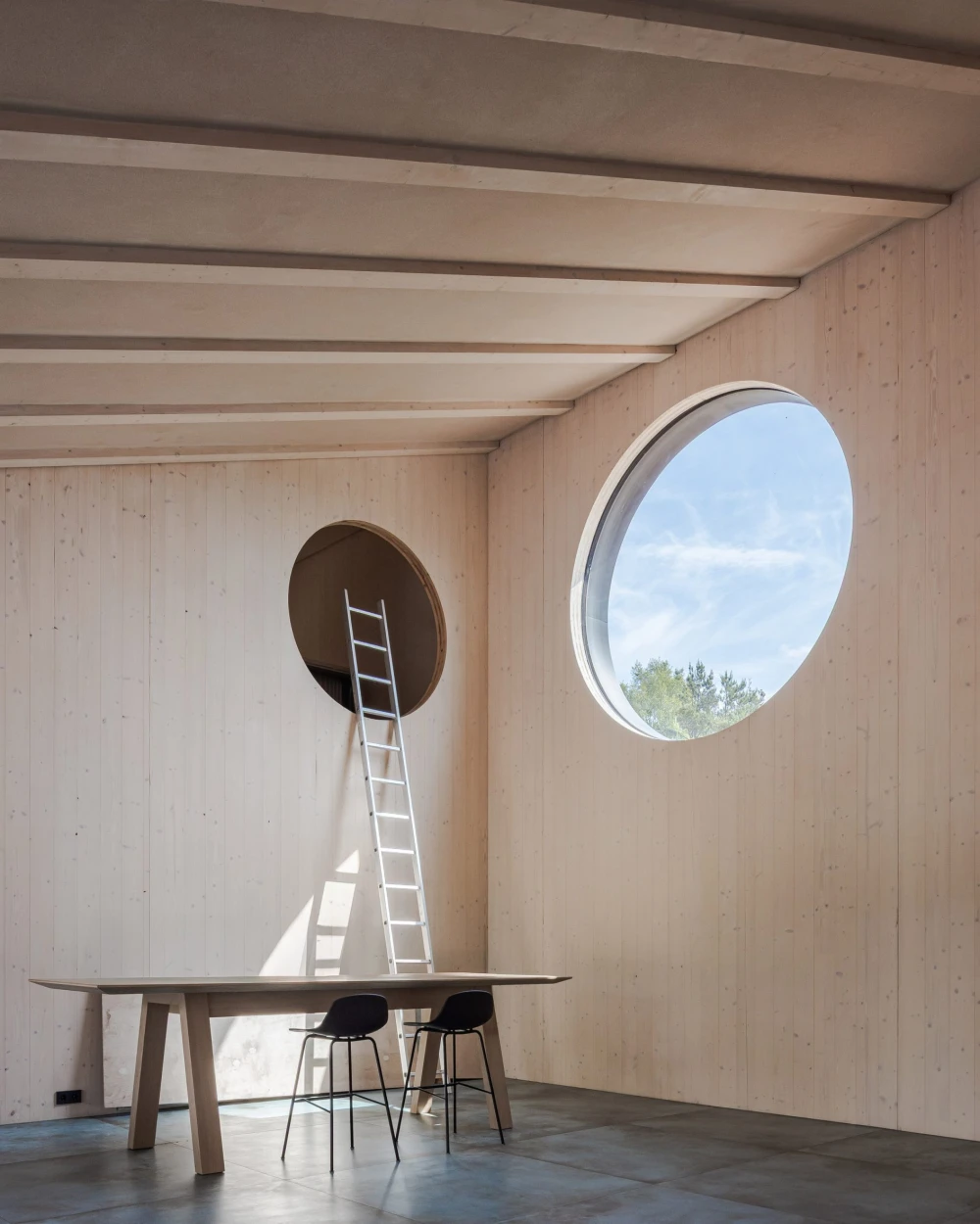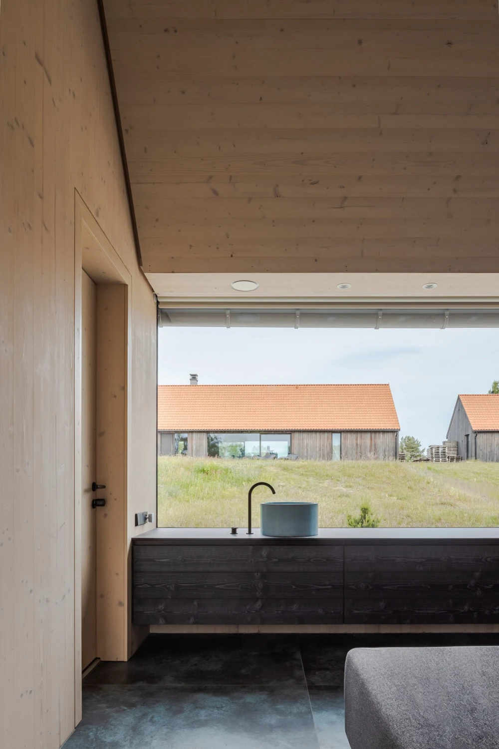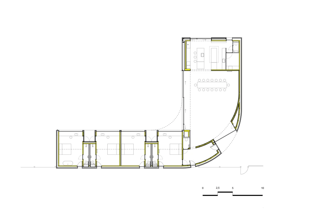 Узкий остроконечный объем на западе, огибая угол участка, плавно раскрывается в более широкий изогнутый односкатный объем на севере. Структурную основу пристройки составляет каркас из клееного бруса, заполненный панелями из перекрестно-клееной древесины (CLT). И каркас, и панели оставили открытыми — это решение подчеркивает внутреннюю отделку и динамичную, меняющуюся геометрию здания. В более узкой части постройки расположены четыре гостевые спальни, а изогнутую центральную часть занимают большая гостиная, столовая и кухня. Раздвижные стеклянные двери во всю высоту ведут в сад, который отделяет пристройку от основного дома. Внутренняя отделка из необработанного дерева создает контраст с черными поверхностями: обугленными деревянными деталями на кухне и в спальнях и темным каменным полом.