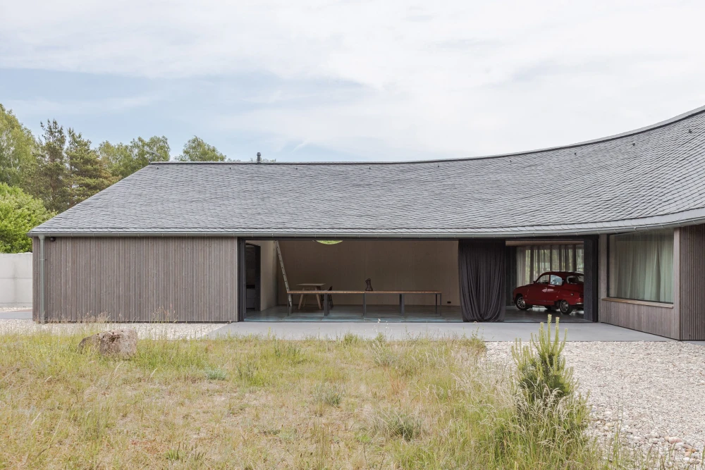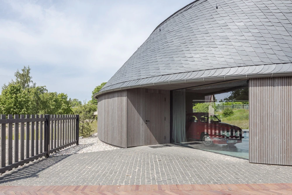 Снаружи дом обшит узкими деревянными досками, а изогнутая крыша полностью покрыта натуральной сланцевой черепицей. Она была выбрана за ее особую способность отражать и преломлять солнечный свет, когда тот скользит по извилистой поверхности кровли. «Мы провели бесчисленное количество итераций моделирования, чтобы добиться нужной кривизны, которая соответствовала бы месту, контексту и функционалу дома, — говорит Круминя. — Этот изгиб постоянно меняется, если смотреть на него под разными углами и при разном освещении, постоянно напоминая нам о том, насколько эмоционально насыщенной может быть такая изогнутая геометрия».
