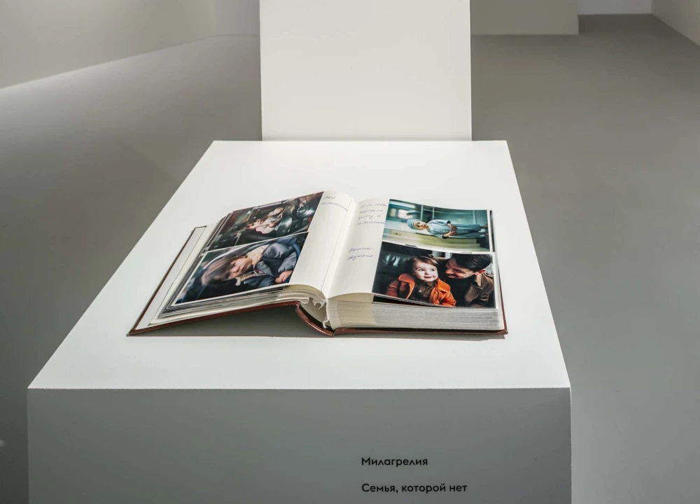 Работа московской художницы Милагрелии представляет собой фотоальбом, в котором собраны воспоминания о жизни целой семьи: сцены свадеб, рождения детей, первые шаги малыша, переезды, путешествия, визиты к бабушкам и дедушкам, даже традиционные снимки кота. Его содержание полностью передает культурный код семьи постсоветского пространства, создавая ощущение живого, наполненного памятью мира. Но особенность работы в том, что весь альбом, несмотря на свою искреннюю атмосферу — снимки, вызывающие трепет и ностальгию, — сгенерирован нейросетью. Глаз посетителя не распознает подмены, но перед зрителем «Семья, которой нет». Такой подход поднимает вопросы о подлинности и виртуальной реальности, показывая, как современные технологии могут имитировать и воссоздавать культурные архетипы.