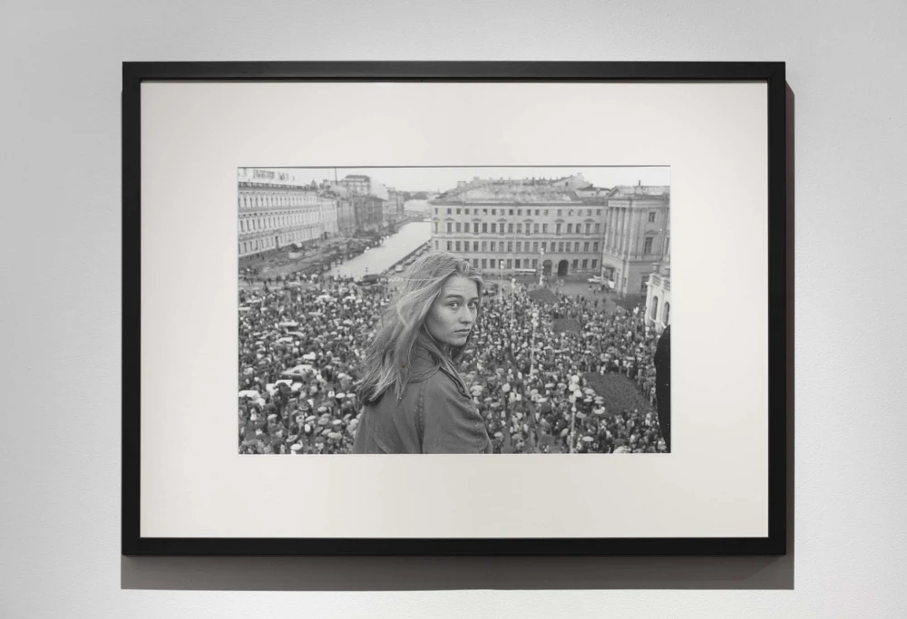 На известном снимке Сергея Подгоркова особенно выразителен конфликт массового и личного: взгляд девушки направлен строго в объектив камеры, он заставляет зрителя прочувствовать эмоциональную напряженность момента, позади нее раскинулась многотысячная толпа на Исаакиевской площади, символизирующая масштаб и историю.