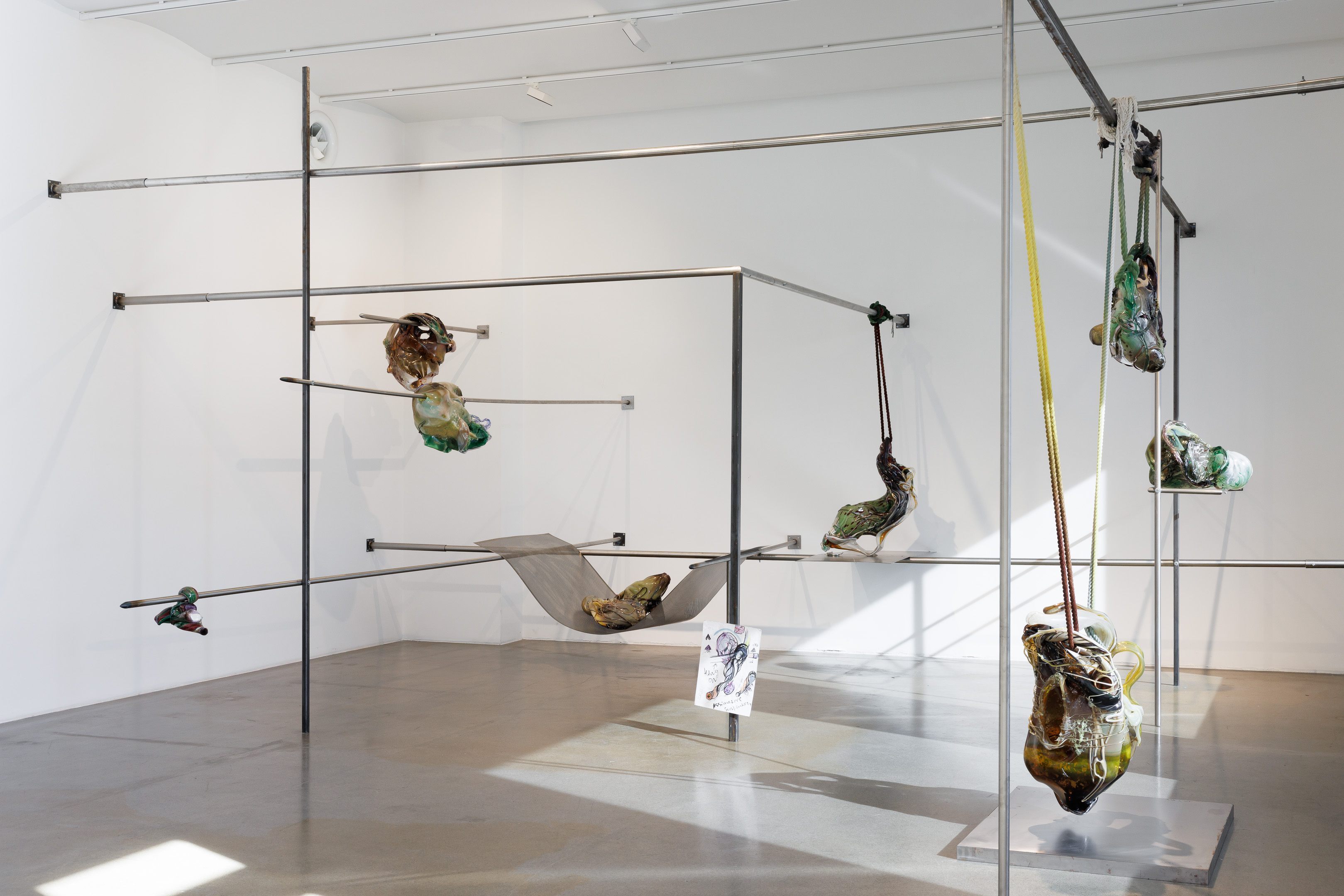 Эффектность экспозиции достигнута за счет синтеза лаконичных и твердых металлических конструкций с живой динамикой стекла. Драматичные формы объектов, будто рожденные самим хаосом, пронизаны жесткими и упорядоченными линиями. «Главная сложность для меня — момент экспонирования искусства, особенно когда речь идет о скульптуре малых форм. У моих работ нет передней и задней части, левой и правой. Поэтому у них не может быть классического подиума. Я создала конструкции, которые можно было бы рассматривать со всех ракурсов. Так пришла идея парящих конструкций и подвесных канатов. В проекте я выступала и художником, и куратором, и архитектором. Это было сложно, но и очень интересно. Обожаю инженерные и архитектурные задачи, особенно работу с металлом, варить конструкции, решать технические вопросы. Для меня большим счастьем было разработать архитектонику выставки, пусть это было и очень сложно», — продолжает она.