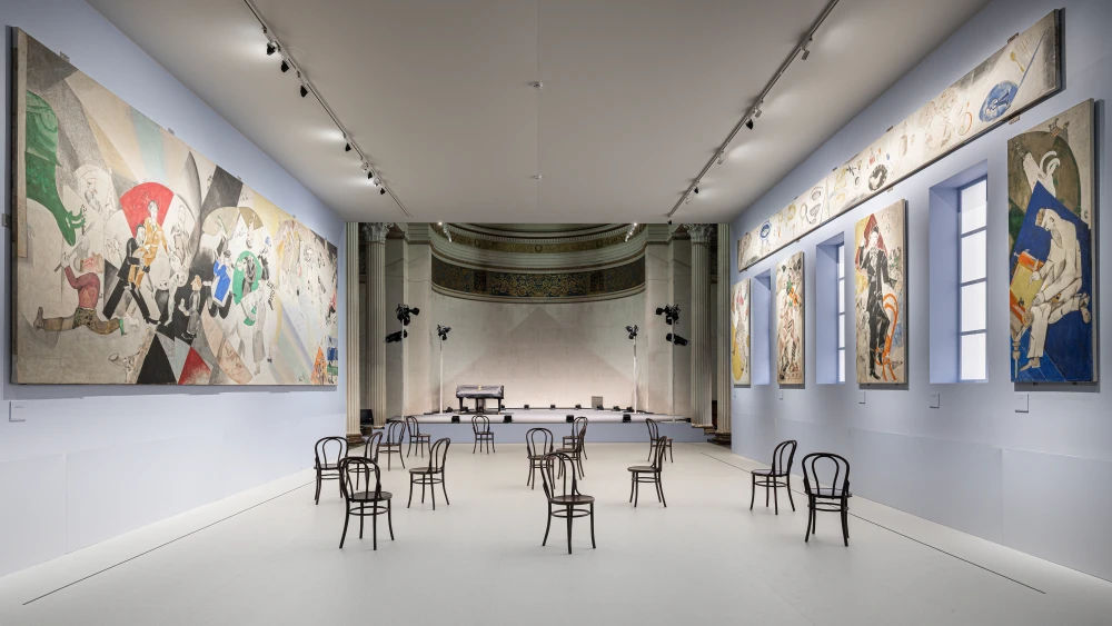 Картины и графика сопровождаются цитатами из автобиографической книги художника «Моя жизнь», что помогает зрителям понять, как сам Шагал задумывал свои произведения. Особый раздел выставки — реконструкция зрительного зала Еврейского камерного театра с декоративными панно Шагала, созданными для спектаклей и ставшими ключевыми работами русского авангарда. Также в программе — просветительские лекции и инклюзивные форматы экскурсий.