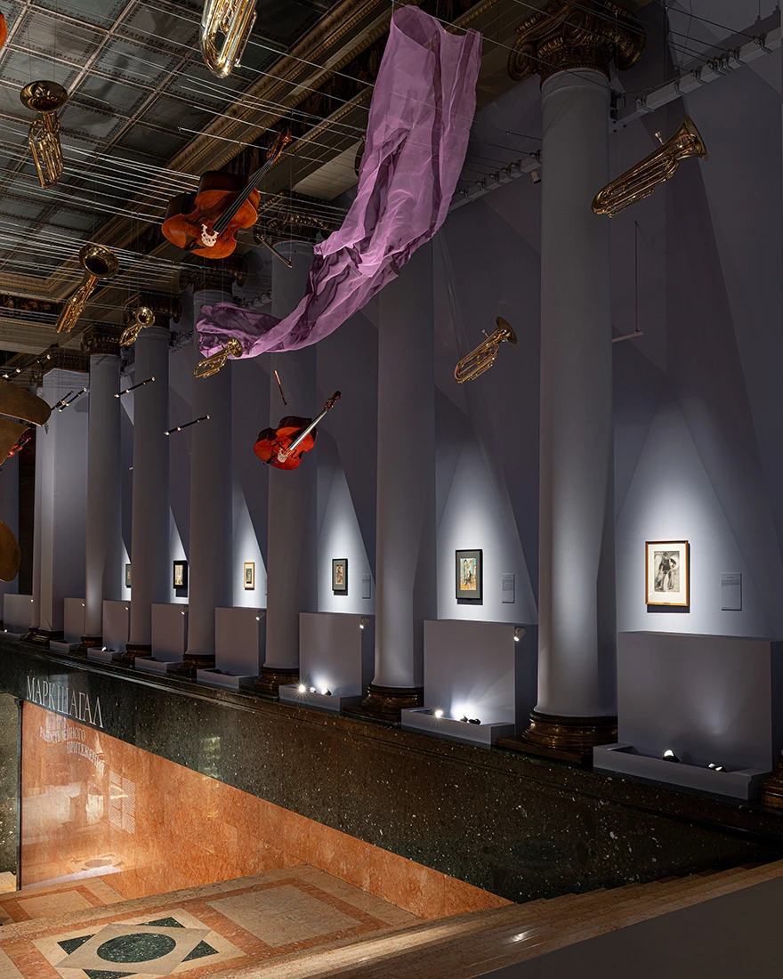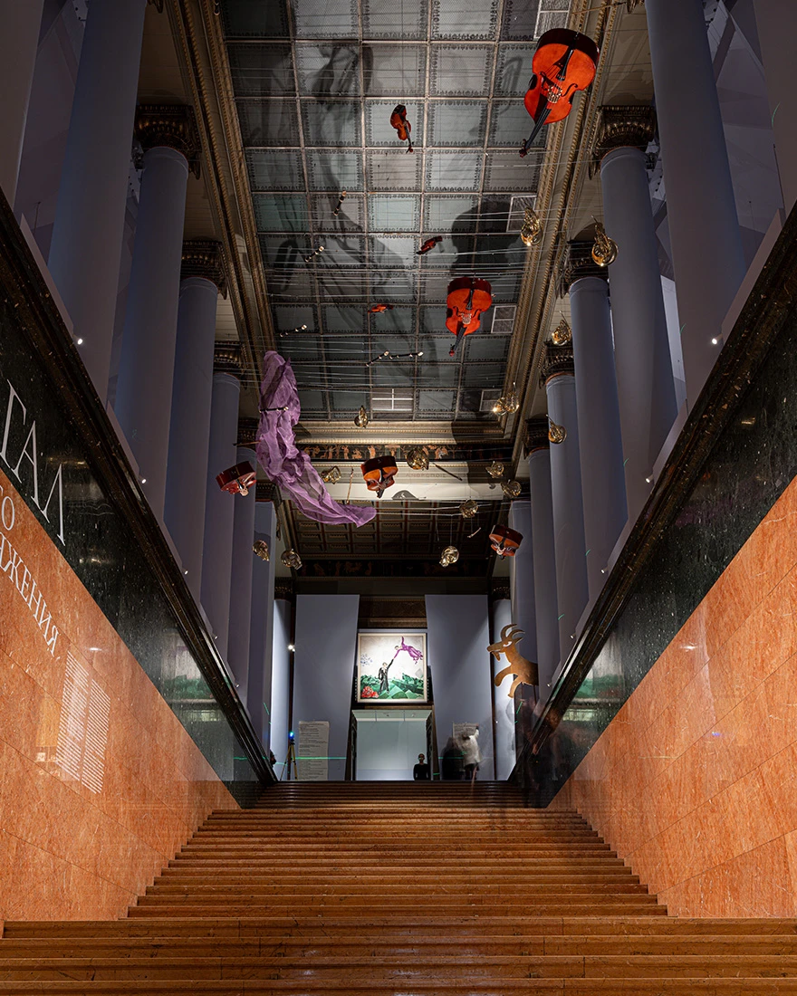 «Измененное пространство на полотнах Шагала напоминает устройство человеческой памяти — все события и герои похожи на себя и узнаваемы, но смотрим мы на них через преломляющее стекло времени, добавляющее неожиданные искажения. Сценография выставки должна быть лишь фоном, оправой для искусства, но при наложении этого фона на стройную классическую архитектуру Пушкинского музея случаются парадоксы: стены театральной «коробочки» разъезжаются и поднимаются к потолку белого зала, прохладный цвет воздуха заливает пространство и переосмысление пространства музея музыка звучит без звука, предметы начинают двигаться в нашем воображении», — комментирует концепцию основатель и генеральный директор музейного бюро Planet9 Агния Стерлигова.