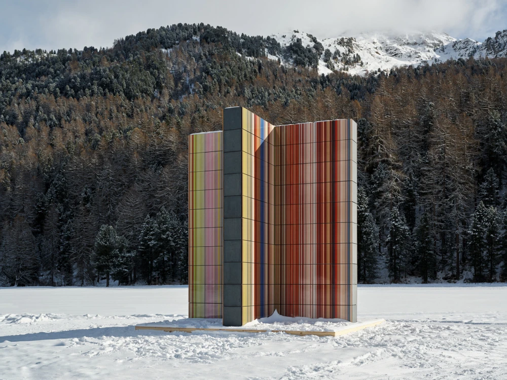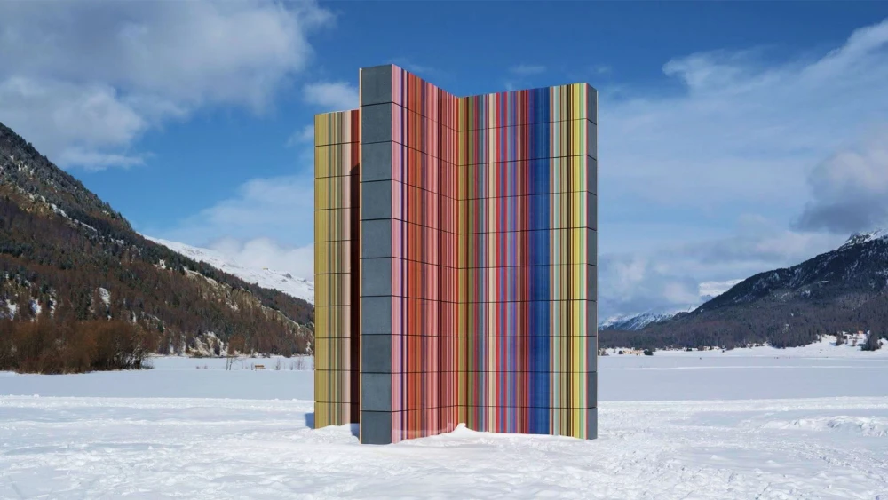 Немецкий художник Герхард Рихтер представил пятиметровую скульптуру Strip Tower (962) в в Энгадине, Швейцария. В основе визуального решения лежат вертикальные цветные полосы, будто сошедшие с картин мастера и перенесенные в трехмерную среду. Восемь перпендикулярных панелей покрыты глазурованной керамической плиткой.