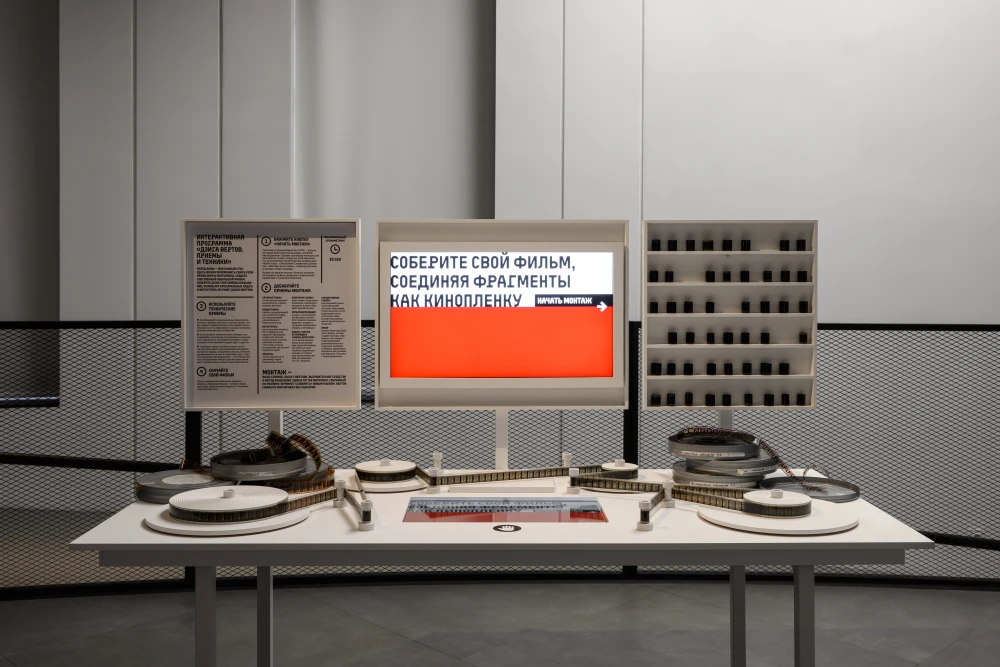 Двигаясь по разделам «Век кино», «Кинонеделя», «Киноправда», «Киноглаз», «Человек с киноаппаратом», «Энтузиазм», «Сказка о великане», «После Вертова», посетитель одновременно оказывается зрителем нескольких десятков экранов, на которых можно увидеть кадры из кинолент Вертова. Дополняют экспозицию фотографии, анимация, отрывки из дневников и киножурналов, а также монтажный стол, где посетители могут попробовать вручную собирать из кадров и интертитров законченное высказывание.