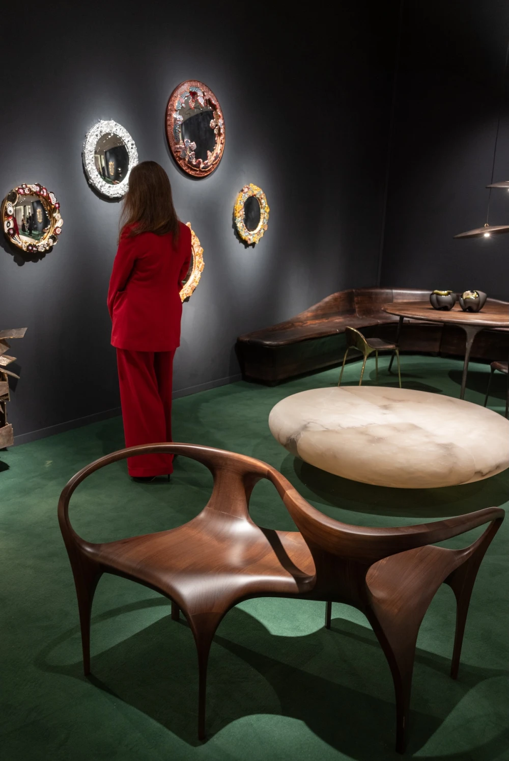 Другие галереи, напротив, обращались к ремеслу как к современной художественной практике. Лондонская Sarah Myerscough Gallery представила экспозицию Crafted Arts, где традиционные техники выступают полноценным языком современного искусства. Здесь были показаны торшеры Desert Insect и Sunrise (18 000 евро) художницы Ори Орисон Мерхав, работающей с натуральным шеллаком, текстильное панно Лин Фанглы (40 000 евро), а также сплетенное из использованной резины панно Патрика Бонгой (26 500 евро). На другом полюсе ярмарки находился стенд Galerie Marcilhac, где интерьер был выстроен как театральная сцена эпохи ар-деко. В центре композиции — мебель Жака-Эмиля Рульмана, дополненная стеклом Рене Лалика и лаковой мебелью Жана Дюнана. Эта реконструкция напоминала, что для дизайнеров 1920-х интерьер был вполне себе целостным пространственным сценарием.