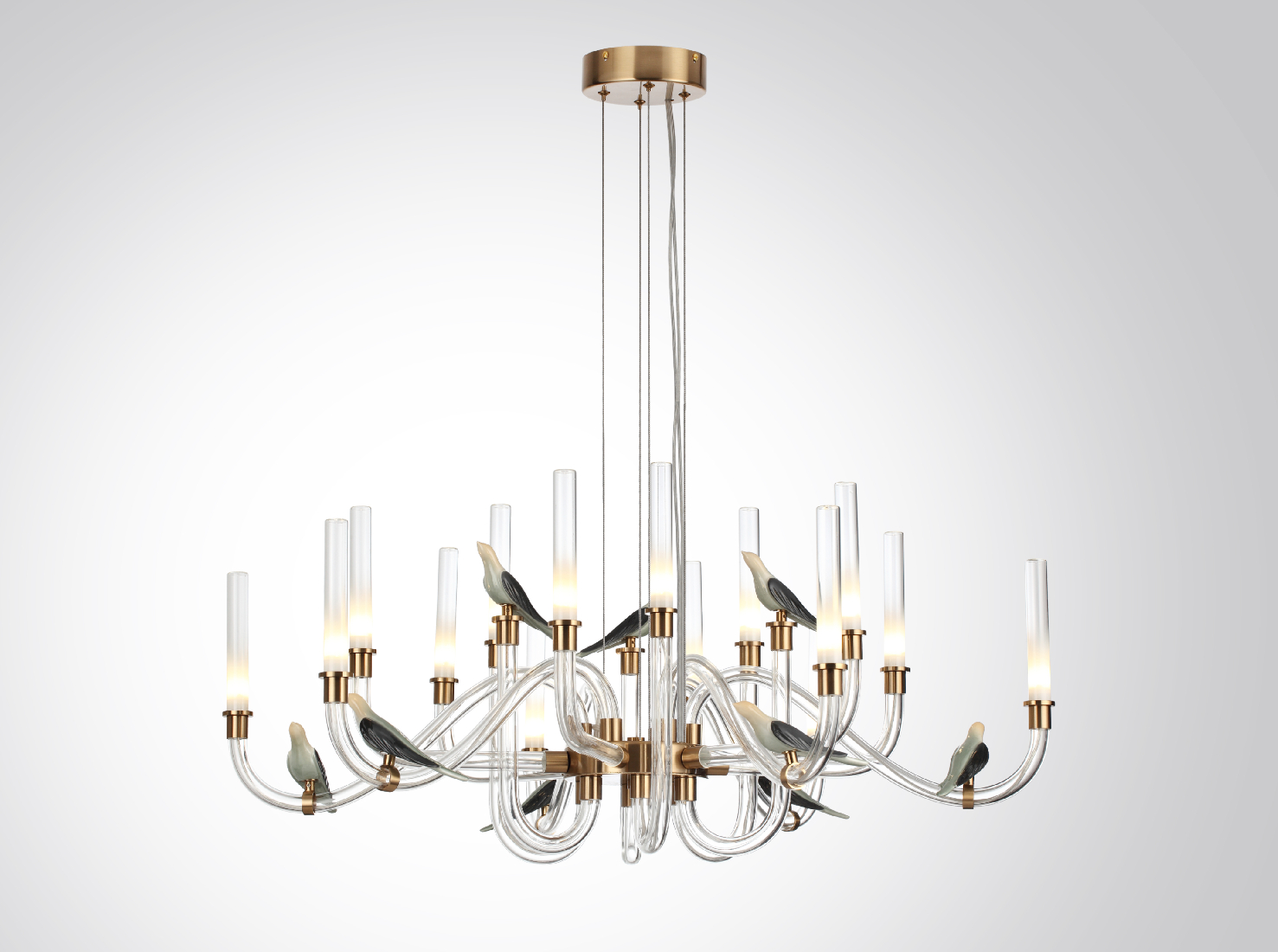 Промышленный дизайнер Варвара Букури представила линию светильников Lark, как симбиоз современных технологий, природы и минималистичного дизайна. Классическая форма стеклянной люстры переосмыслена в более современном исполнении. Строгие и узкие цилиндрические плафоны из прозрачного стекла на которые нанесён белый матовый градиент. А вместо привычной цепи — тонкие металлические тросы, которые создают эффект парения светильника в пространстве и дают возможность регулировать высоту расположения люстр. Главный декоративный элемент — керамические птицы ручной работы, покрытые глянцевой глазурью. Градиент на птицах придаёт им особую реалистичность.