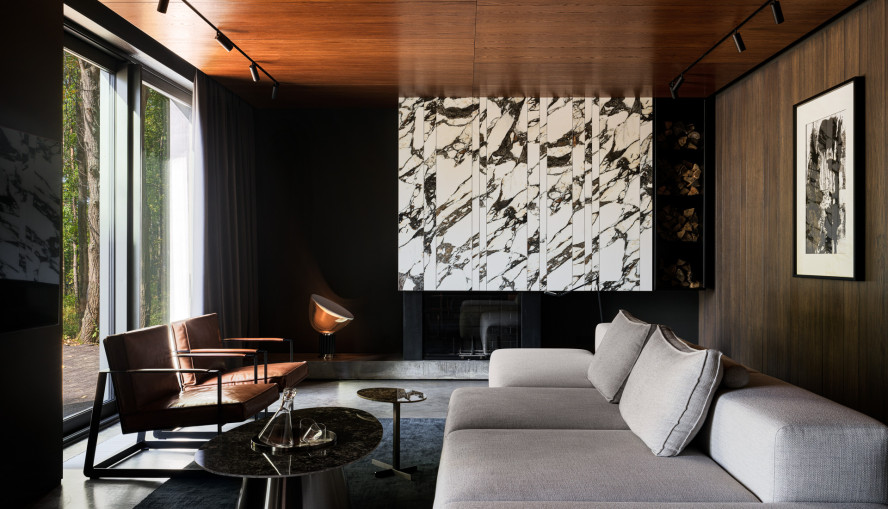 Стиль интерьера сочетает элементы японского брутализма и конструктивизма.