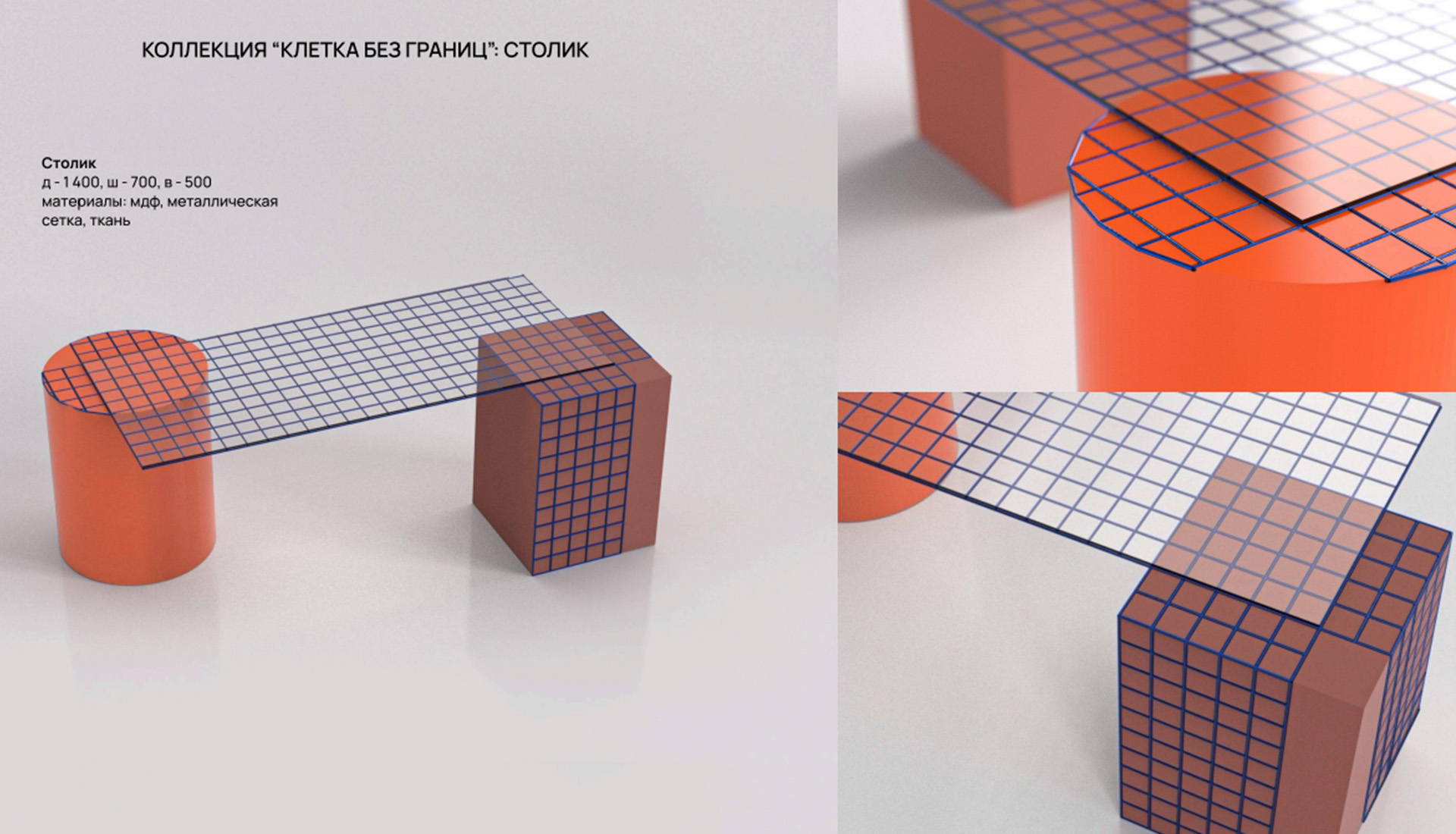 Коллекция «Клетка без границ», разработанная Василием Галицким, представляет собой игру с формой, фактурой и цветом, в которой клетка выступает не как символ ограничения, а как точка для безграничного творчества. Состоящая из двух столиков, пуфа и пары светильников, коллекция создает диалог между строгой геометрией и живой энергией. Стекло в светильниках иллюстрирует внутреннюю структуру клетки, а яркий цветовой контраст усиливает выразительность форм. Пуф с каркасом из клетки и тканевой обивкой добавляет динамику, демонстрируя, что даже в четких формах есть место жизнерадостности. Минималистичный дизайн и смелое сочетание цветов подчеркивают новаторский дух коллекции, утверждая, что клетка — это источник вдохновения, где геометрия обретает свободу, а простота становится ключом к инновациям.
