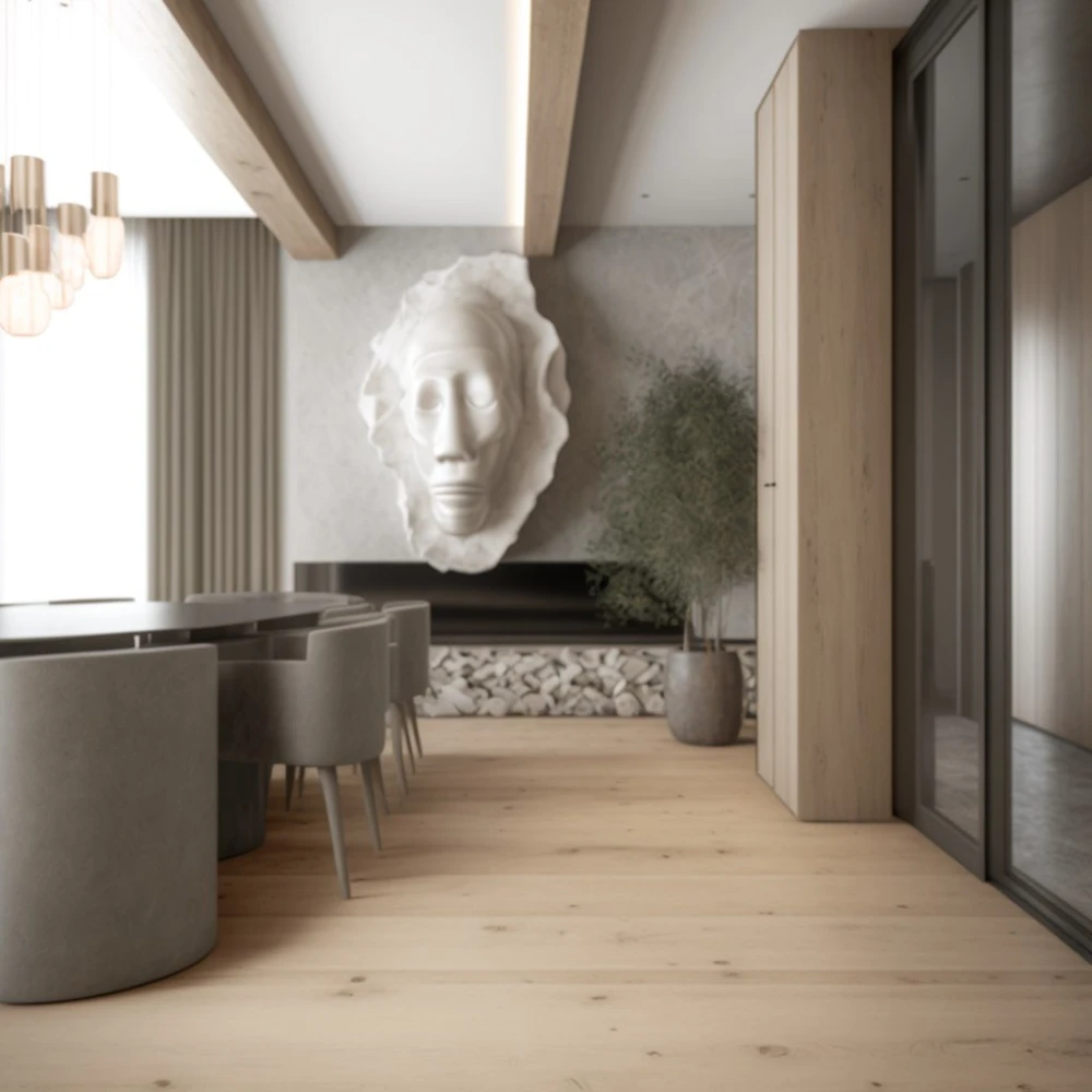 Артем Журавок и его студия специализируются на минималистичных интерьерах, в которых спокойный фон оживляют интересные детали: богатые фактуры натурального камня и древесины, рельефные панно на стенах, акцентные светильники. Уже разработанные проекты послужили отправной точкой, из которой выросли визуализации интерьера будущего. В них Артем гармонично вписал продукты SOFIA: потолочно-стеновые панели в шпоне, привносящие ощущение близости к природе, и стеклянные межкомнатные перегородки, с помощью которых можно эффективно зонировать пространство, визуально не перегружая его.