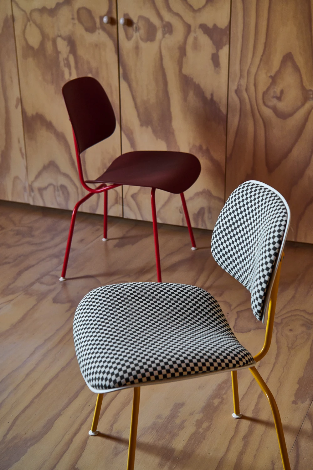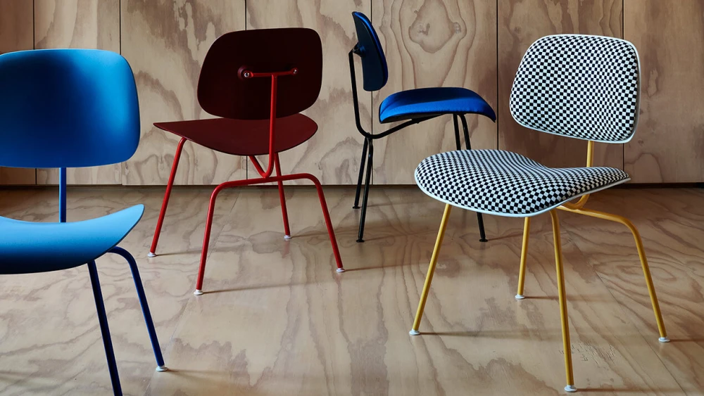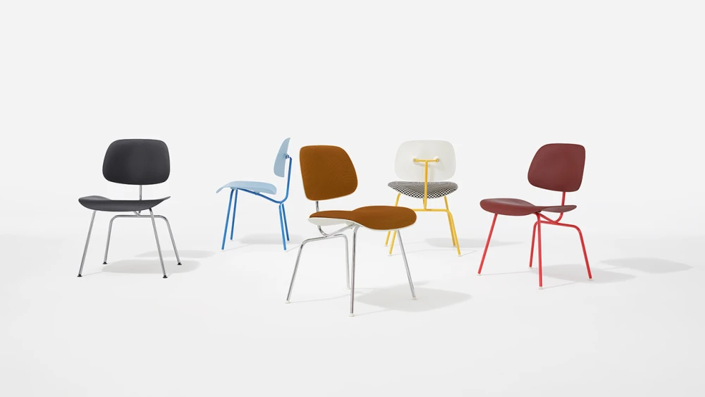 В коллекции представлено четыре варианта сидений, шесть оттенков основания и несколько тканей. Ножки могут быть выполнены не только в классическом хроме, черном и белом, но и в голубом, желтом и красном цветах. Вдохновляясь эстетикой Чарльза и Рэй, Herman Miller пригласил бренд Maharam для разработки обивок. В коллекцию вернулась культовая ткань Hopsak Александра Жирара — в ней выпускалась оригинальная модель в начале семидесятых. Новые отделки отсылают к архитектурной игре The Toy, которую Имзы представили в 1951 году: это набор ярких цветных панелей, из которых можно создать бесконечное множество различных конструкций.