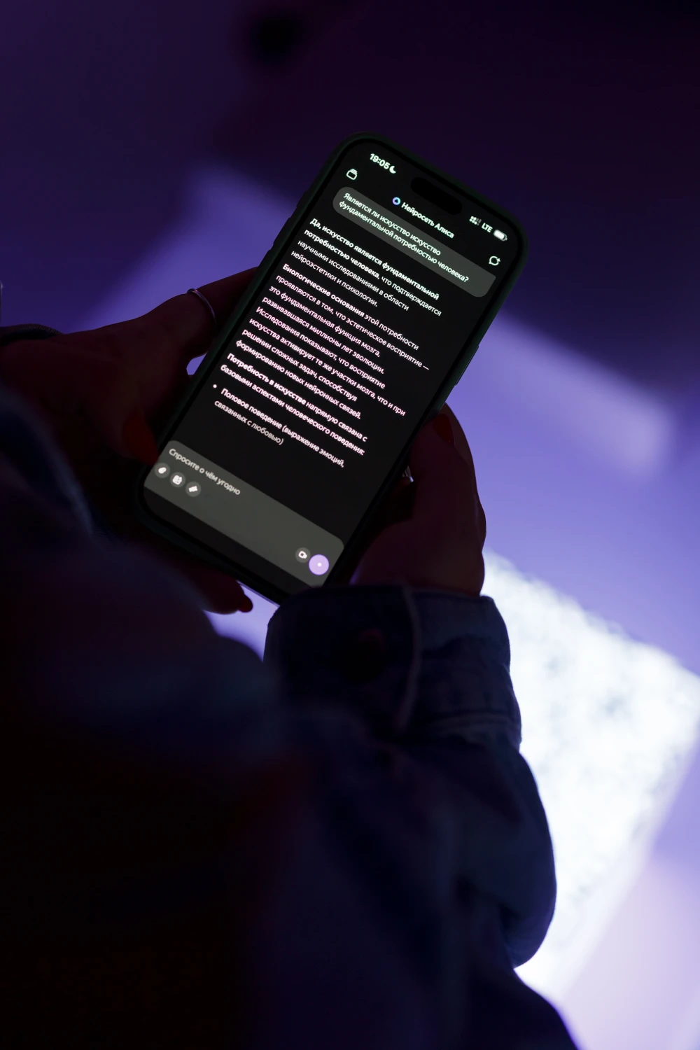 Над этими и другими темами гости экспозиции могли поразмышлять вместе с нейросетью Алисой, чтобы в диалоге осмыслить свои впечатления, найти ответы на самые сложные вопросы о природе творчества в эпоху искусственного интеллекта и подумать о том, как меняется сфера сегодня.