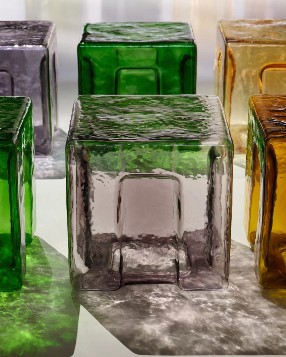 Кубические полупрозрачные табуреты высотой 43 сантиметра имеют слегка неровные, будто рукотворные поверхности и углубления. Предметы создавались с использованием чугунной формы и выгравированы с использованием технологии ЧПУ. «Скульптурный силуэт и смелые пропорции объектов, напоминающие каменную архитектуру, контрастируют с присущими стеклу несовершенствами, создавая ощущение текучести и движения», — сообщают в студии.