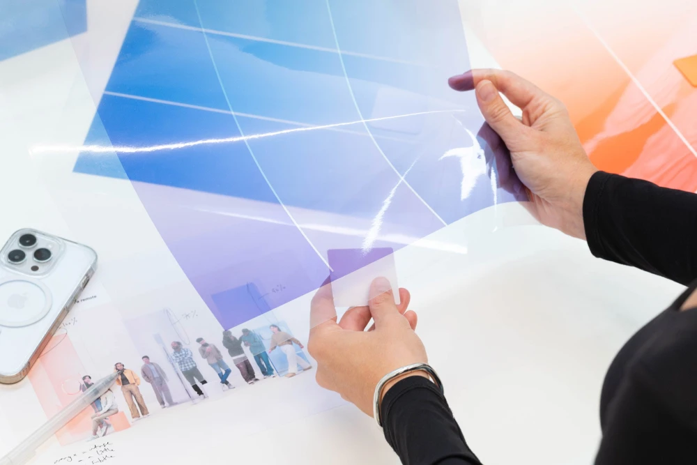 В пространстве The Observatory разместилась композиция из полупрозрачных панелей, которая является материальным воплощением деконструкции нового интерфейса Liquid Glass. Панели сделаны в цветах iPhone 17 — Cosmic Orange, Mist Blue и Lavender, которые Марселиз смогла увидеть одной из первых. В своей работе художница одновременно использует методы компьютерного и физического прототипирования. Оттенки для стекла подбирались с помощью Photoshop, в то время как предметы из смолы окрашивали вручную, добавляя пигменты в материал.
