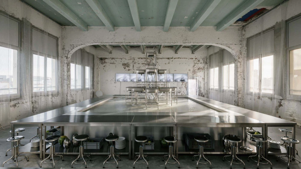 В рамках арт-недели 2023 в Париже кулинарный проект We Are Ona пригласил Crosby Studios придумать стенографию ужина для ценителей дизайна и искусства. Гарри Нуриев сделал ставку на индустриальный шик, используя классические делали большой промышленной кухни.