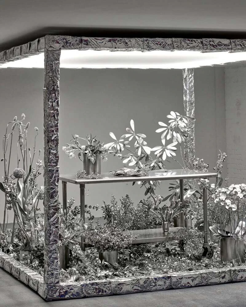 Летом 2025 Гарри Нуриев и студия цветочного дизайна Flover открыли однодневную инсталляцию в частном таунхаусе в Бруклине. Серебряный бокс органично соединил биофильные формы и промышленные материалы, подчеркивая значение отходов и вторичных материалов в создании нового. Многослойное пространство напоминало творческую лабораторию, где время остановилось.