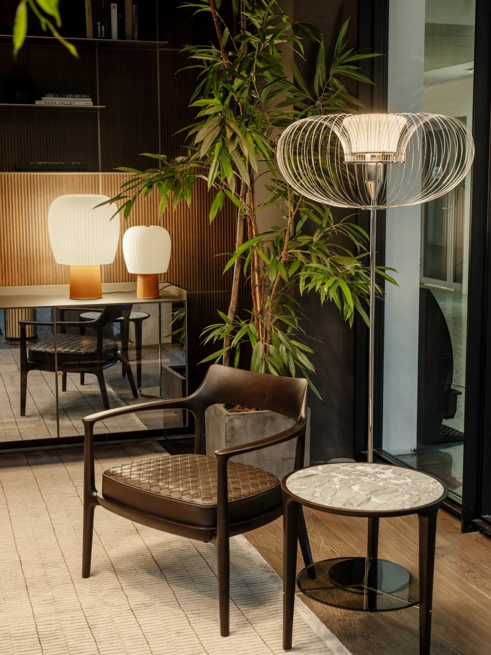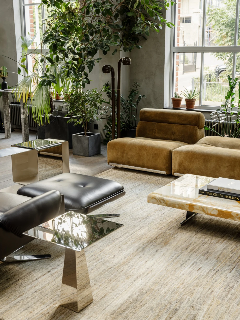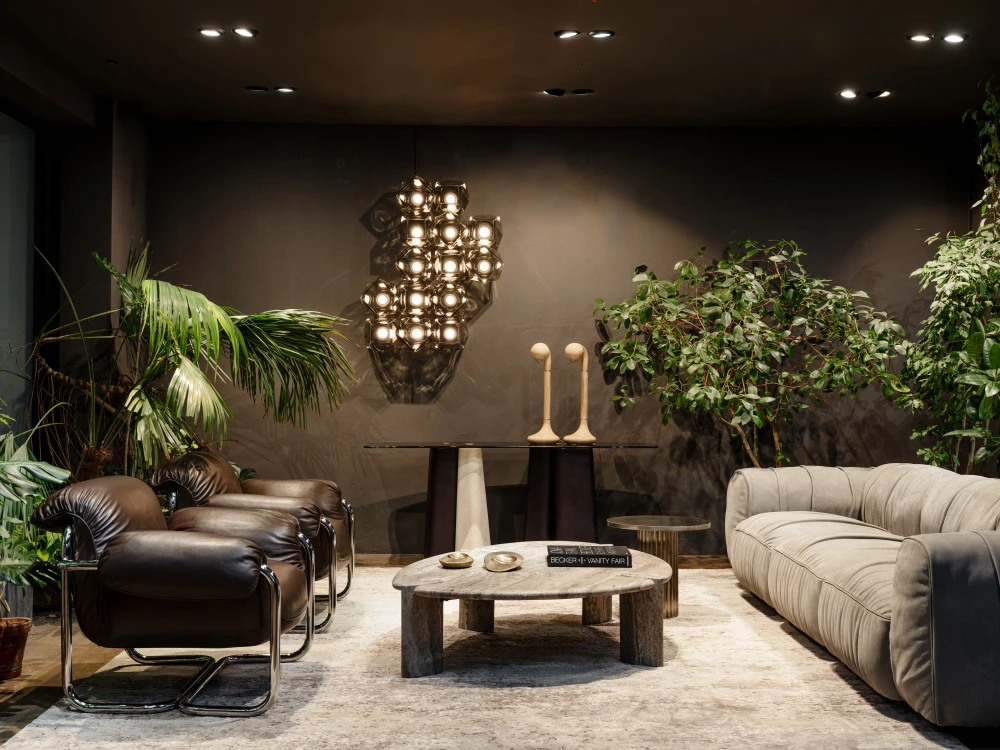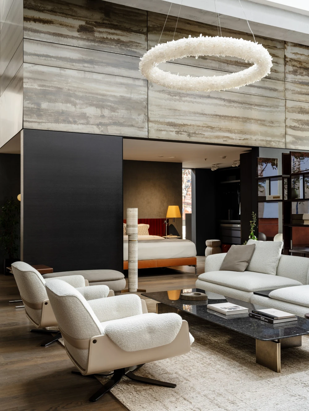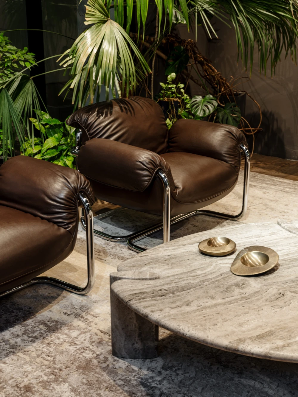 В интерьерном салоне KRASSKY обновилась экспозиция: 70% пространства заняли новые коллекции 2025/26 года. Концепция этого сезона — «В объективе 70-х» — осмысляет свободную и выразительную эстетику той эпохи. Главная роль отведена новинкам Minotti, которые можно увидеть сразу в трех зонах. Так, первая представляет работы Джанпьеро Тальяферри: систему сидений Coupé, предметы из коллекции Libra, кресла Laurel и скульптурные столики Nastro, в которых эстетика модернизма сочетается с элементами скандинавского дизайна.