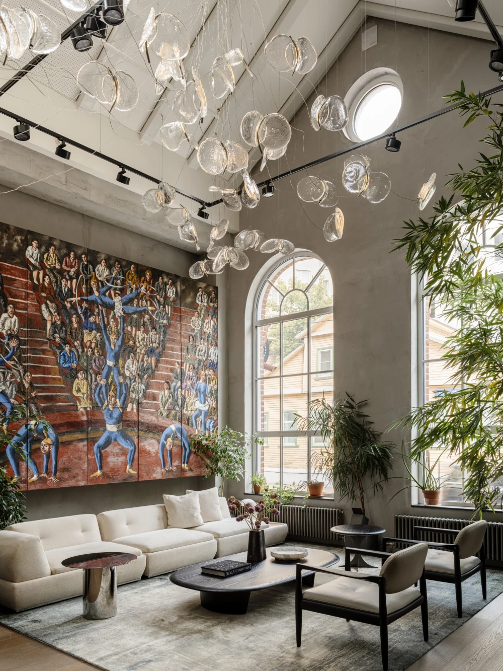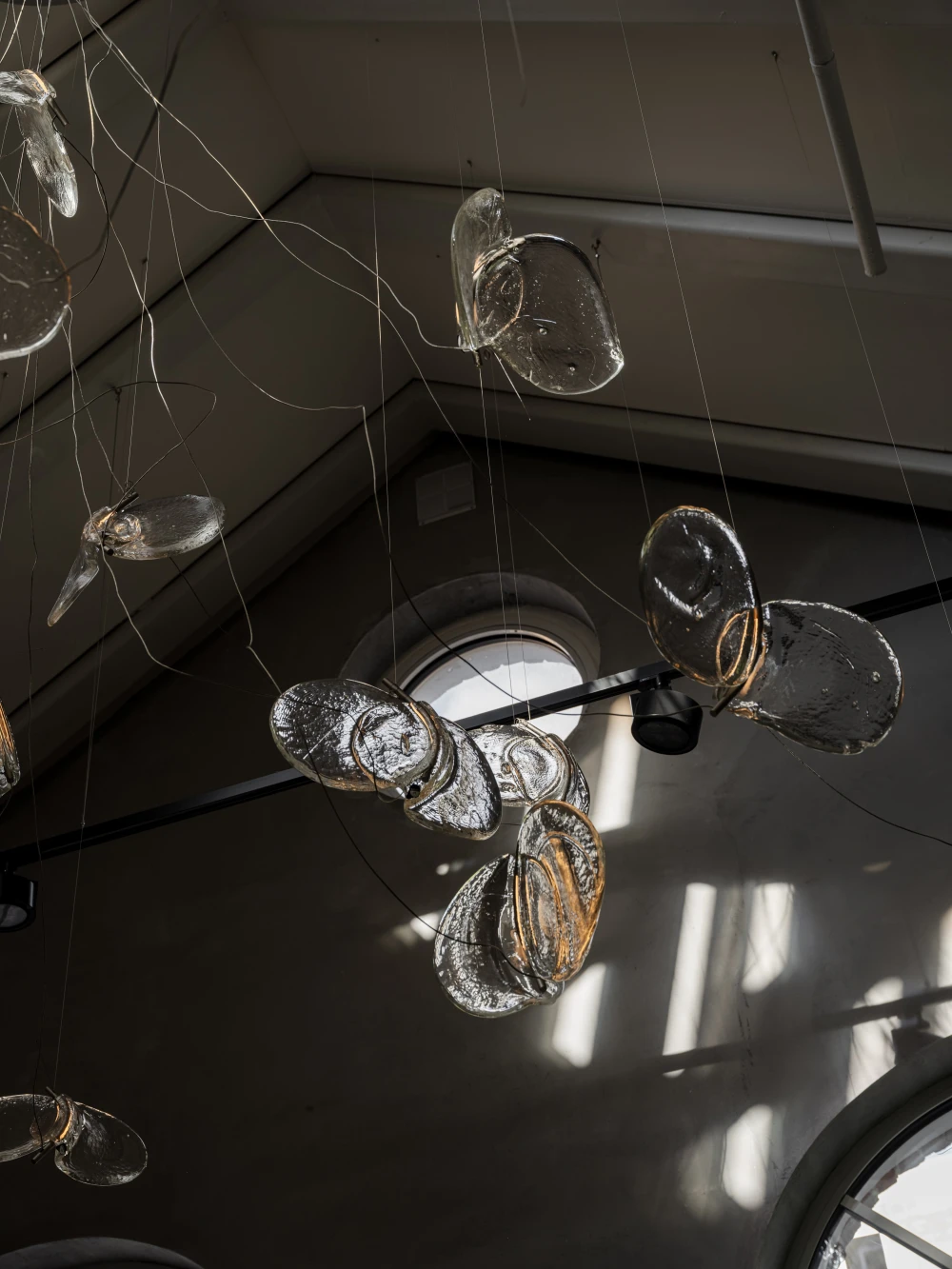 Пространство продолжает раскрываться в зоне бренда Henge, где диван Obilio от Özelgin Tanju, соседствует с индустриальными светильниками SPYDER 80 от Массимо Кастаньи. Акцентом здесь выступает журнальный столик Isola от Родерика Воса для Linteloo: его столешница с органичным силуэтом и тонкой резьбой напоминает узор, который волны оставляют на песке. Особого внимания заслуживает световая инсталляция 141 от канадской студии Bocci. Каждый светильник — это результат эксперимента, в котором два ковша горячего стекла свободно выливаются на стержень, создавая застывшие в движении паттерны. Для основателя студии Омера Арбеля это и есть красота в непредсказуемости.
