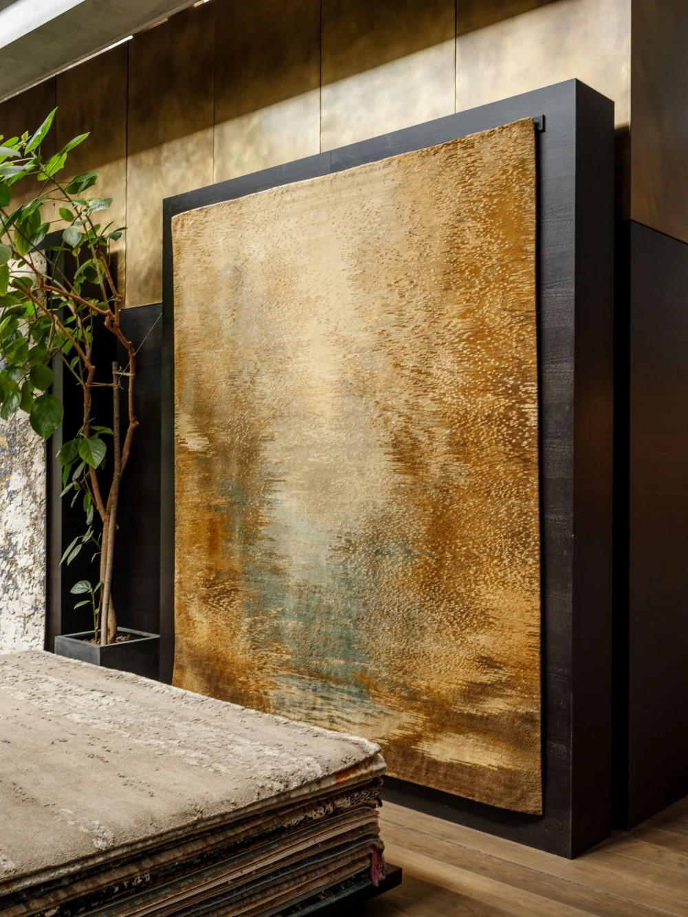 Подборка тканей объединила тактильные льняные фактуры от нового бельгийского бренда Bruder, работу с натуральными и нетрадиционными волокнами от Naturtex, а также две новые коллекции Pierre Frey — «пустынную» Deserts и яркую Fantasy, вдохновленную 70-ми. Завершают палитру новинок ткани Dedar с использованием знаменитого синего пигмента Ива Кляйна и Sporting collection от Holland & Sherry с ее изысканной клубной полоской. В представлении ковров Jan Kath сделан акцент на экзотических материалах и сложных техниках. В работах используются шелк, волокна лотоса, шерсть мериноса и альпаки в сочетании со срезным ворсом, петлей и рельефом. Флагман — ковер DOTO, удостоенный награды Red Dot Design Award 2025.