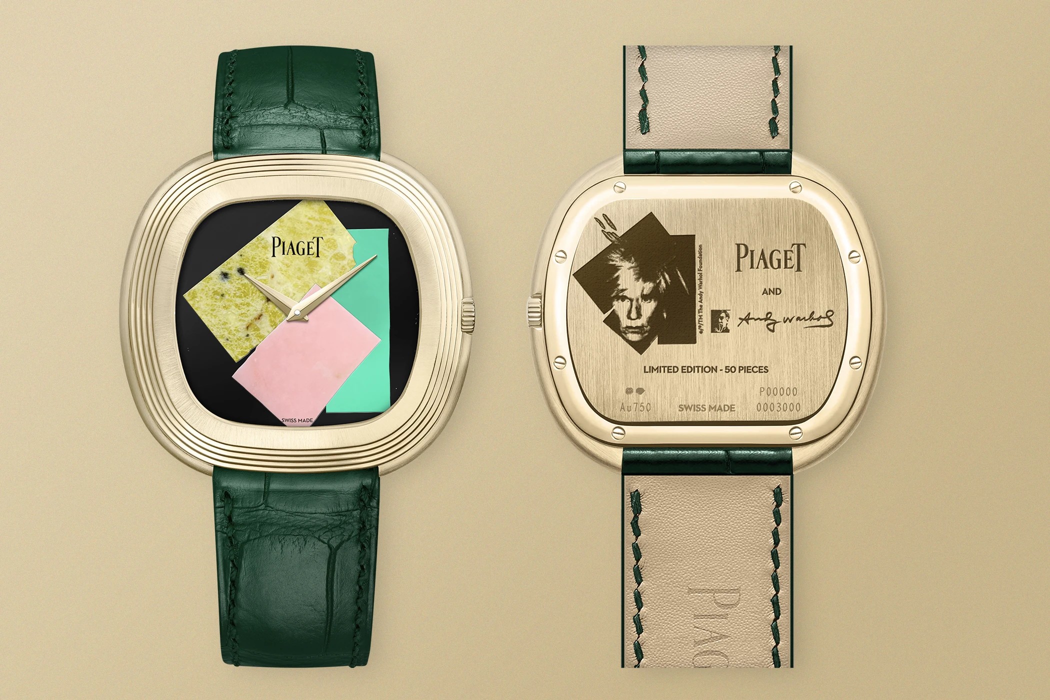 Циферблат сделан из черного оникса — этот же материал использовался в личных часах Уорхола Piaget 1973 года. Корпус из 18-каратного желтого золота повторяет форму той оригинальной модели, а на задней крышке выгравирован контур автопортрета 1986 года, дополненный подписью художника и логотипом марки.