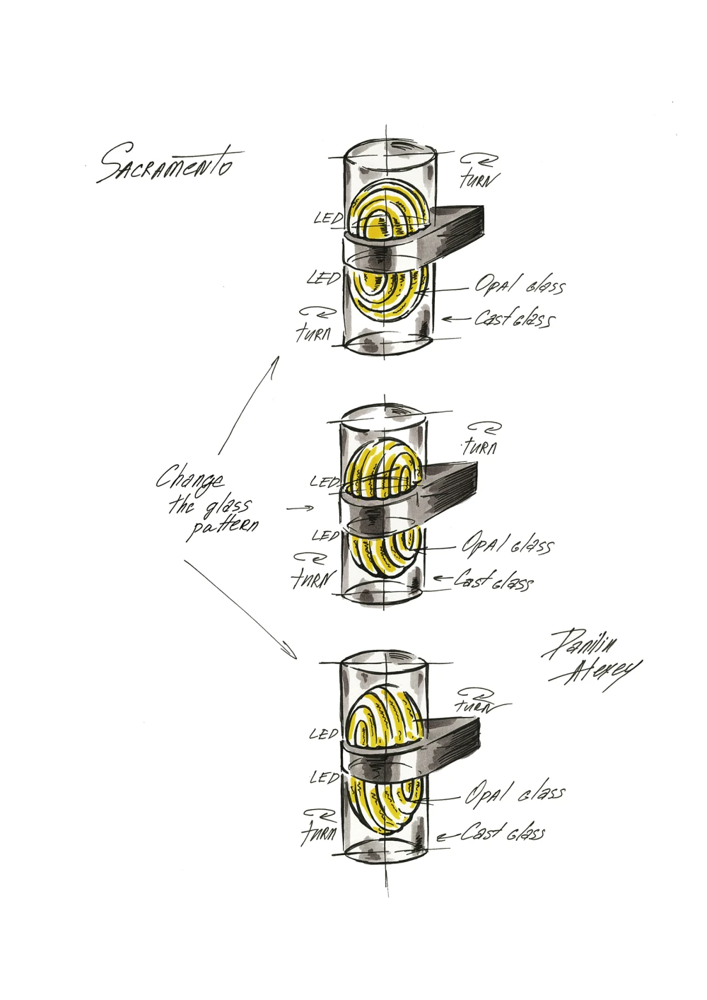 «В основе этой коллекции лежат две ключевые идеи. Первая — иллюзия матового светящегося шара, который на самом деле является полой формой, вырезанной из цельного стекла и матированной изнутри. Это решение обеспечивает мягкий свет и делает корпус светильника более компактным. Вторая идея — трансформация: с помощью вращающихся стеклянных элементов можно менять орнамент. Дополнительную гибкость в дизайне придает возможность как вертикального, так и горизонтального настенного монтажа».