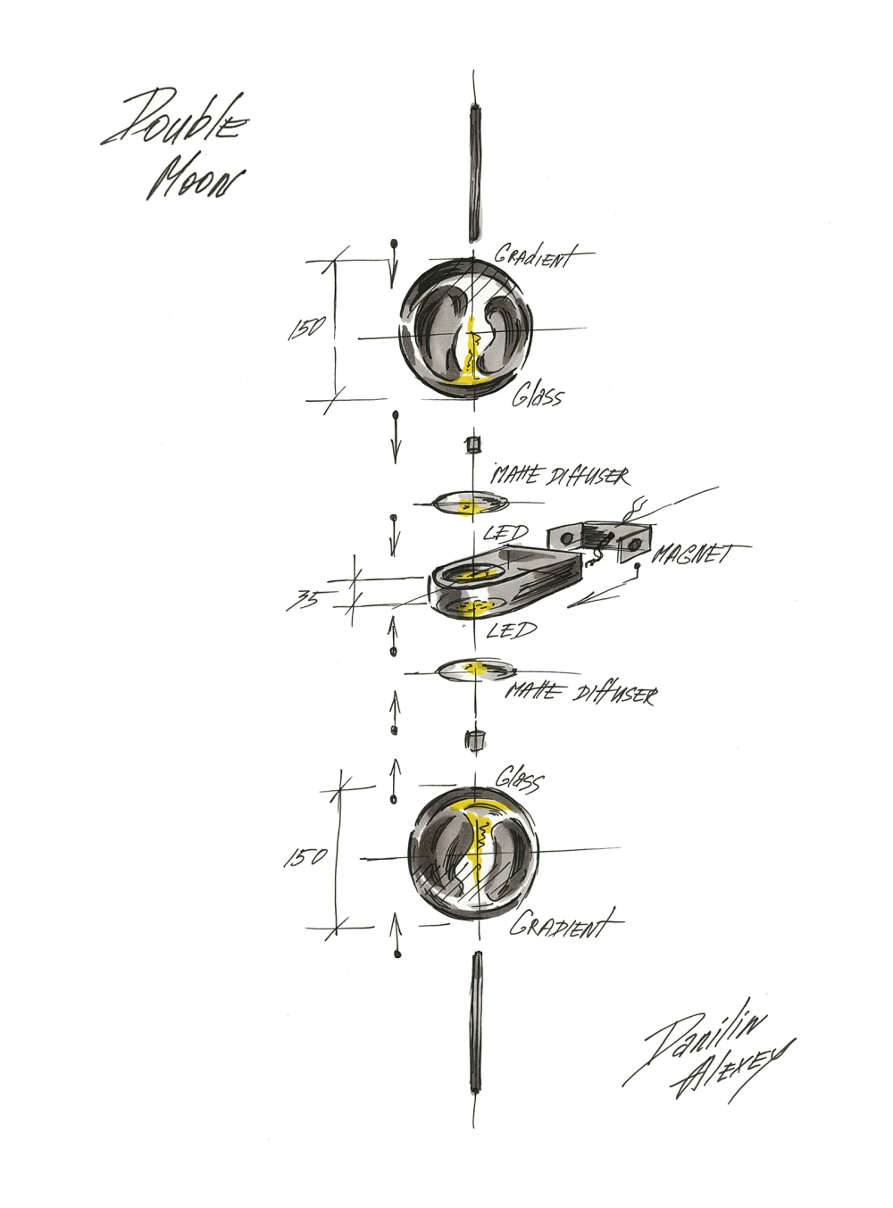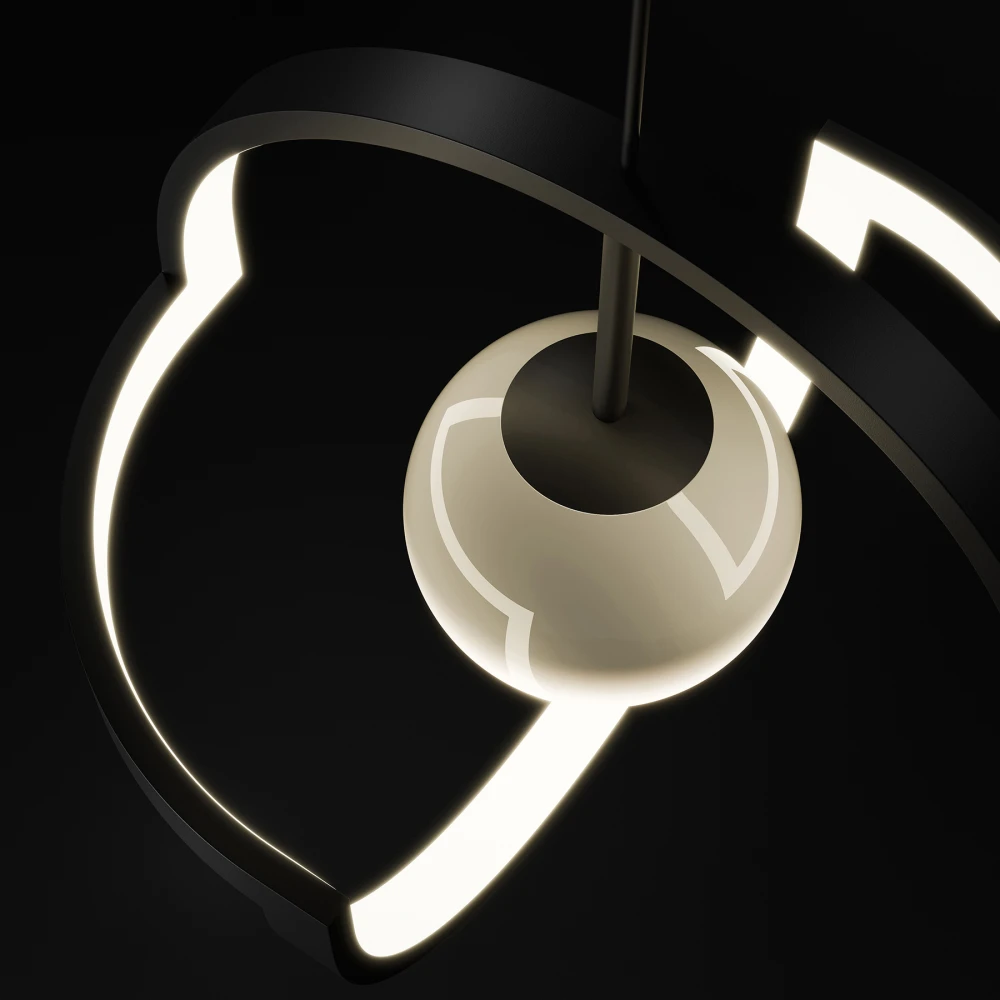«Для создания светильника с таинственным чарующим эффектом были использованы различные технологии. С обеих сторон основания скрыты источники света с матовыми рассеивателями, создающими мягкое свечение. Стеклянные шары покрыты зеркальным градиентом, отражающим свет и рождающим сложные оптические эффекты. Все крепления выполнены по уникальной магнитной системе, сохраняющей визуальную чистоту конструкции».