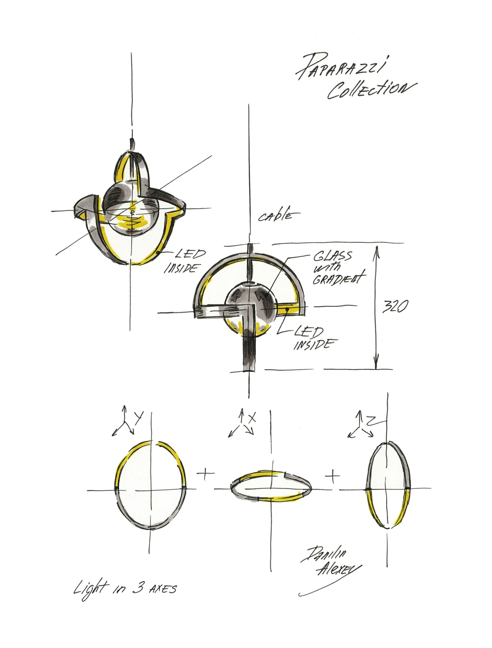 «Эта парадоксальная коллекция бросает вызов традициям: здесь в центре внимания оказывается не источник света, а декоративный стеклянный элемент. Благодаря конструкции из нескольких дуг он светит сразу в трех плоскостях. Словно настоящие папарацци, источники света подсвечивают каждую грань стекла, рождая яркую игру бликов и отражений, которые подчеркивают идеальную красоту сферической формы».