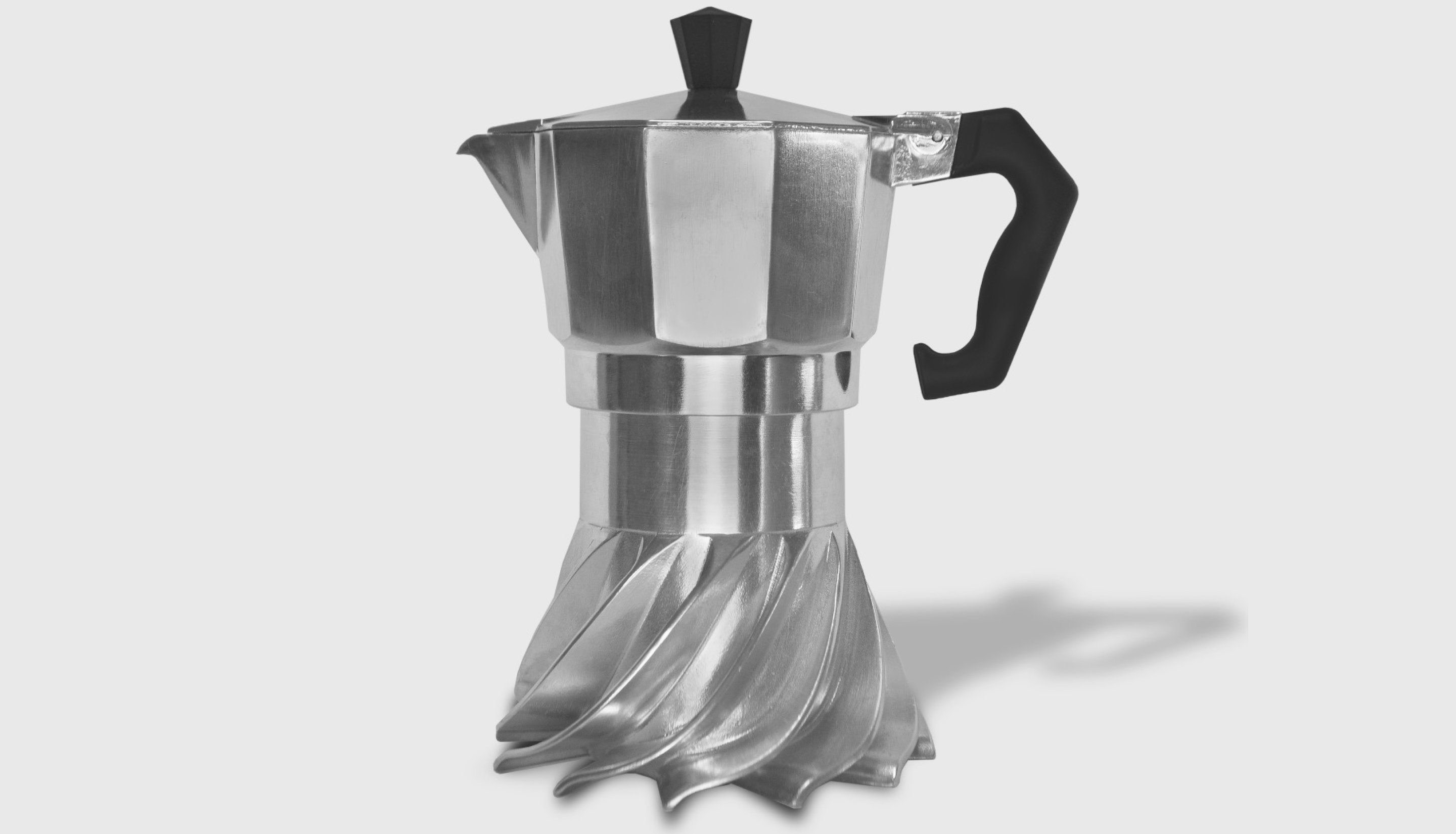 Главное отличие — спиральное основание, вдохновленное геометрией авиационных турбин. Благодаря ему площадь соприкосновения с пламенем увеличена на 93% по сравнению с классической Moka, что обеспечивает равномерное распределение тепла и экономию энергии до 50%. Turbo Moka готовит кофе в два раза быстрее традиционной модели, расходуя примерно на треть меньше энергии. Фронтини называет проект «эволюцией, а не переизобретением» — он сохраняет культурный код итальянской кофеварки, но адаптирует ее к современным стандартам устойчивости и функциональности.